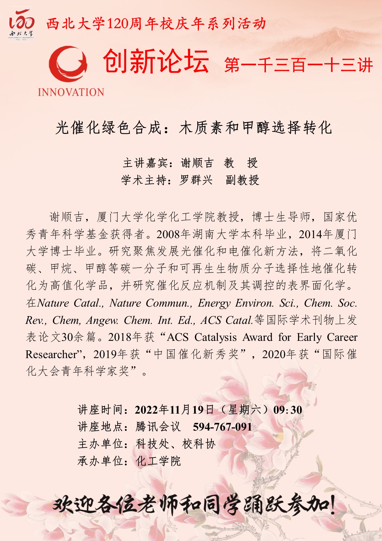 谢顺吉 教授 广发体育创新论坛第一千三百一十三讲暨120周年校庆年系列活动: 光催化绿色合成:木质素和甲醇选择转化 讲座时间 2022年11月19日(星期六)09:30 讲座地点 腾讯会议( 594-767-091) 讲座人介绍 谢顺吉 教授 讲座内容