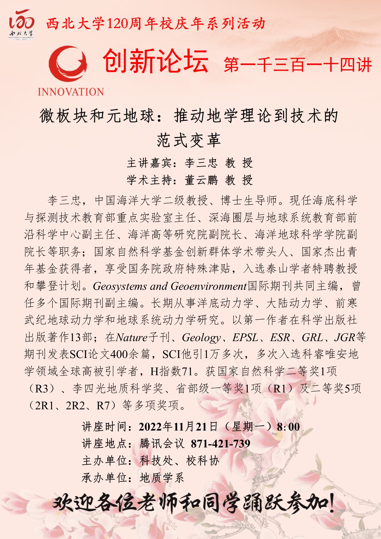 李三忠 教授 广发体育创新论坛第一千三百一十四讲暨120周年校庆年系列活动: 微板块和元地球:推动地学理论到技术的范式变革 讲座时间 2022年11月21日(星期一)8:00 讲座地点 腾讯会议(871-421-739) 讲座人介绍 李三忠 教授 讲座内容