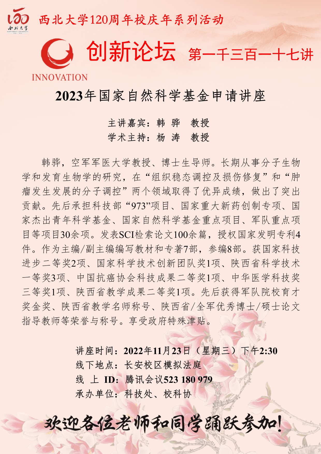 韩骅 教授 广发体育创新论坛第一千三百一十七讲暨120周年校庆年系列活动:2023年国家自然科学基金申请讲座 讲座时间 2022年11月23日(星期三)下午2:30 讲座地点 长安校区模拟法庭 讲座人介绍 韩骅 教授 讲座内容