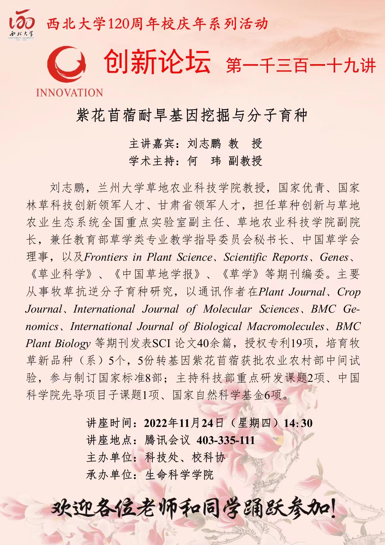 刘志鹏 教授 广发体育创新论坛第一千三百一十九讲暨120周年校庆年系列活动: 紫花苜蓿耐旱基因挖掘与分子育种 讲座时间 2022年11月24日(星期四) 14:30 讲座地点 腾讯会议403-335-111 讲座人介绍 刘志鹏 教授 讲座内容