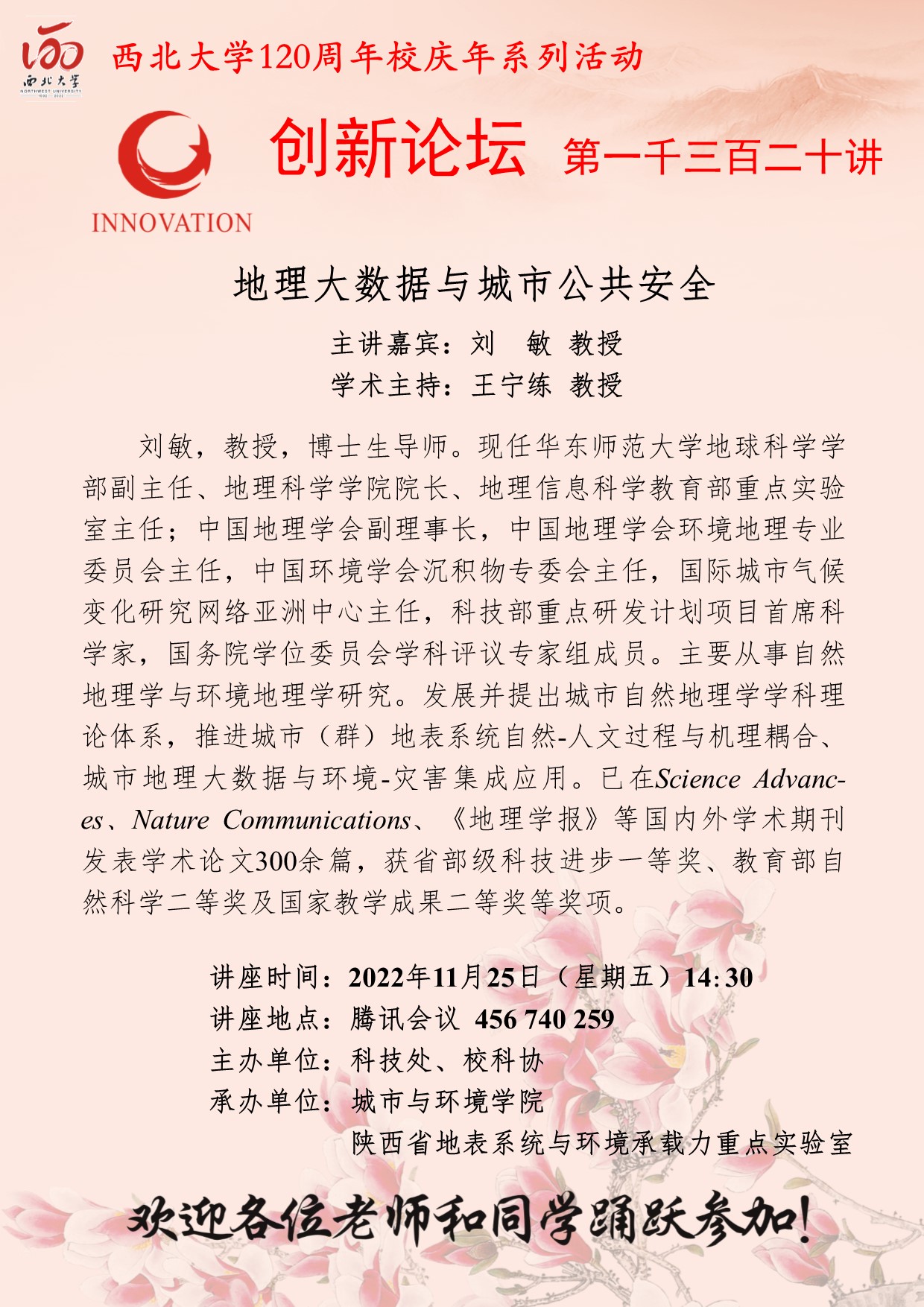 刘敏 教授 广发体育创新论坛第一千三百二十讲暨120周年校庆年系列活动: 地理大数据与城市公共安全 讲座时间 2022年11月25日(星期五)14:30 讲座地点 腾讯会议 456 740 259 讲座人介绍 刘敏 教授 讲座内容