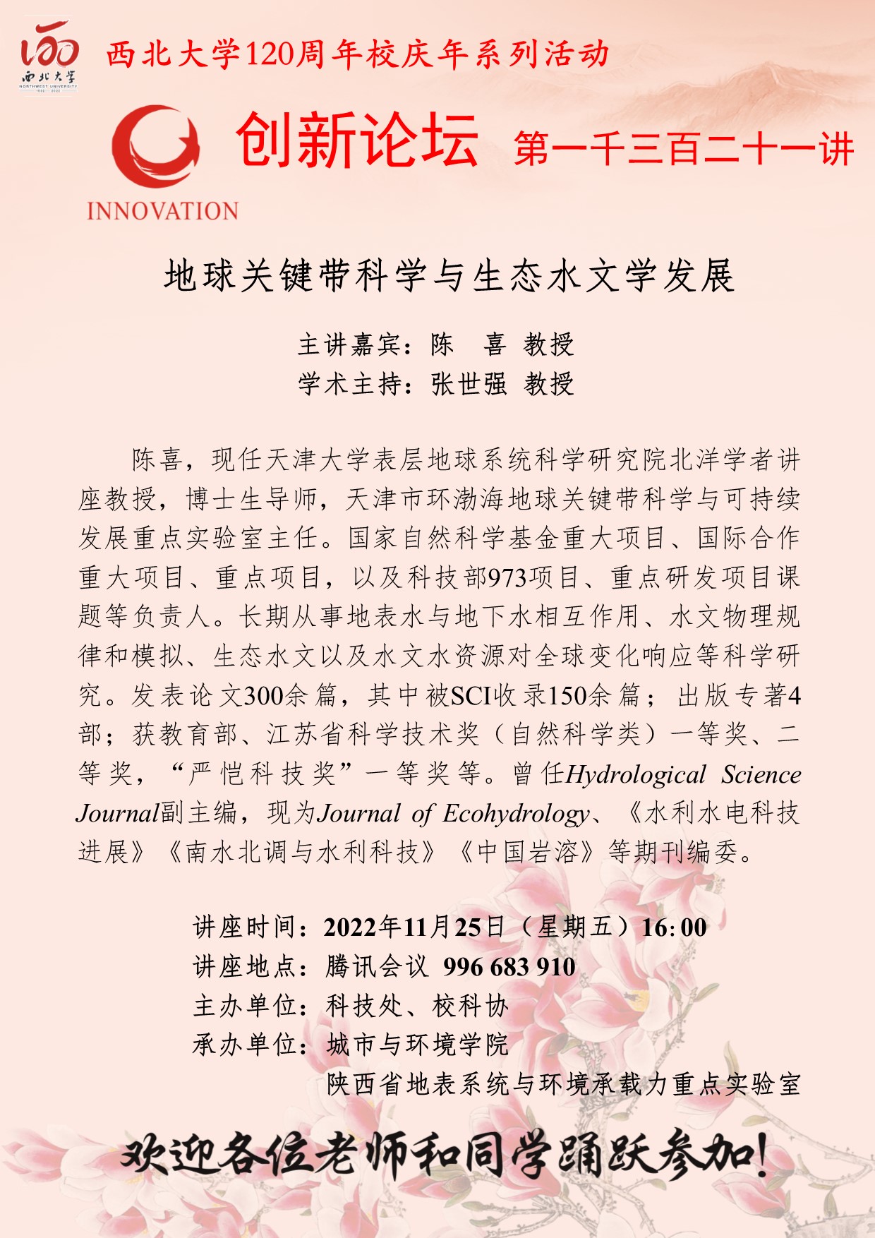 陈喜 教授 广发体育创新论坛第一千三百二十一讲暨120周年校庆年系列活动:地球关键带科学与生态水文学发展 讲座时间 2022年11月25日(星期五)16:00 讲座地点 腾讯会议 996 683 910 讲座人介绍 陈喜 教授 讲座内容