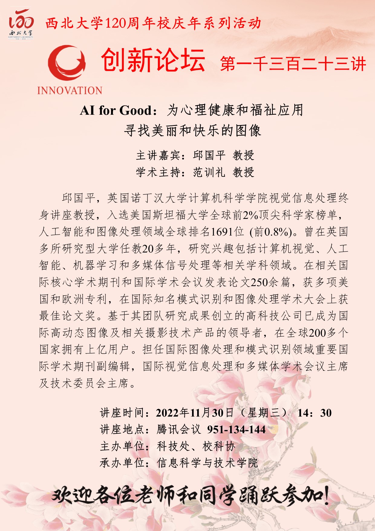 邱国平 教授 广发体育创新论坛第一千三百二十三讲暨120周年校庆年系列活动:AI for Good:为心理健康和福祉应用寻找美丽和快乐的图像 讲座时间 2022年11月30日(星期三) 14:30 讲座地点 腾讯会议 951-134-144 讲座人介绍 邱国平 教授 讲座内容