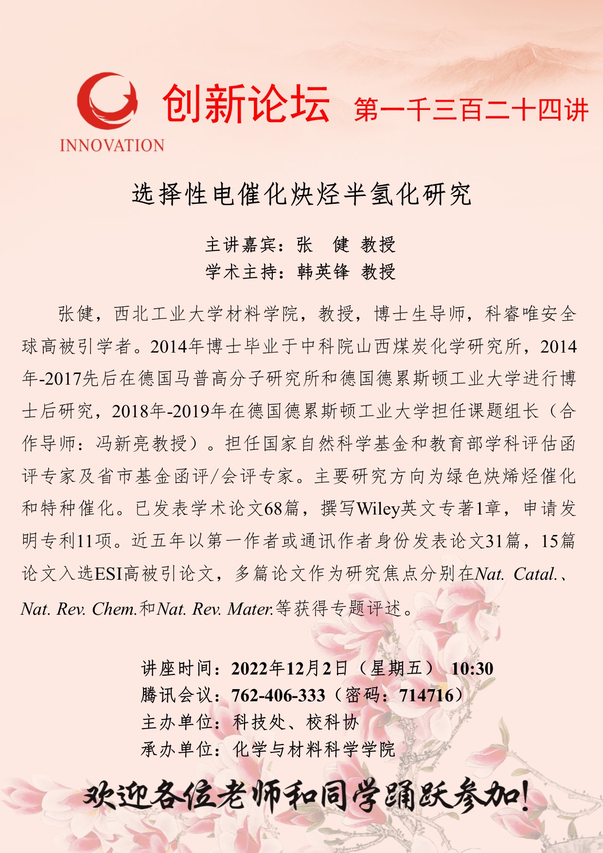 张 健 教授 广发体育创新论坛第一千三百二十四讲:选择性电催化炔烃半氢化研究 讲座时间 2022年12月2日(星期五) 10:30 讲座地点 腾讯会议762-406-333(密码:714716) 讲座人介绍 张 健 教授 讲座内容