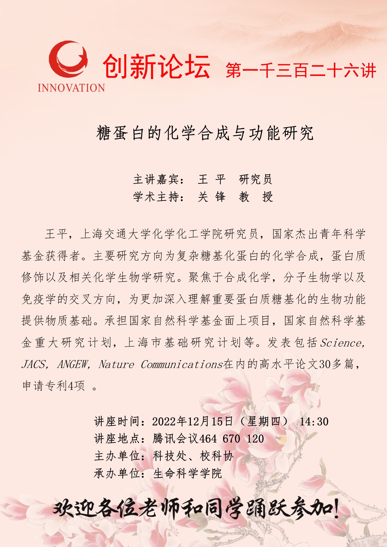 王平 研究员 广发体育创新论坛第一千三百二十六讲:糖蛋白的化学合成与功能究 讲座时间 2022年12月15日(星期四) 14:30 讲座地点 腾讯会议464 670 120 讲座人介绍 王平 研究员 讲座内容