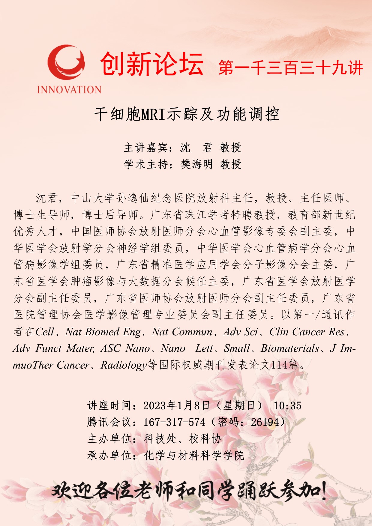 沈君 教授 广发体育创新论坛第一千三百三十九讲:干细胞MRI示踪及功能调控 讲座时间 2023年1月8日(星期日) 10:35 讲座地点 腾讯会议:167-317-574 讲座人介绍 沈君 教授 讲座内容