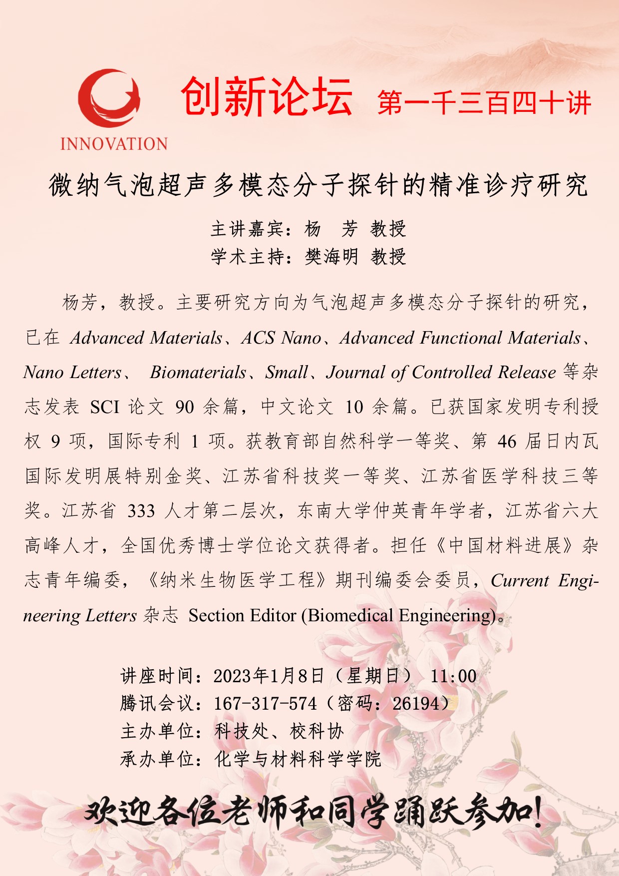 杨芳 教授 广发体育创新论坛第一千三百四十讲:微纳气泡超声多模态分子探针的精准诊疗研究 讲座时间 2023年1月8日(星期日) 11:00 讲座地点 腾讯会议:167-317-574 讲座人介绍 杨芳 教授 讲座内容