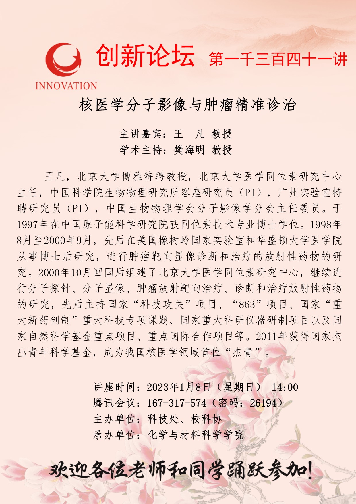 王凡 教授 广发体育创新论坛第一千三百四十一讲:核医学分子影像与肿瘤精准诊治 讲座时间 2023年1月8日(星期日) 14:00 讲座地点 腾讯会议:167-317-574 讲座人介绍 王凡 教授 讲座内容