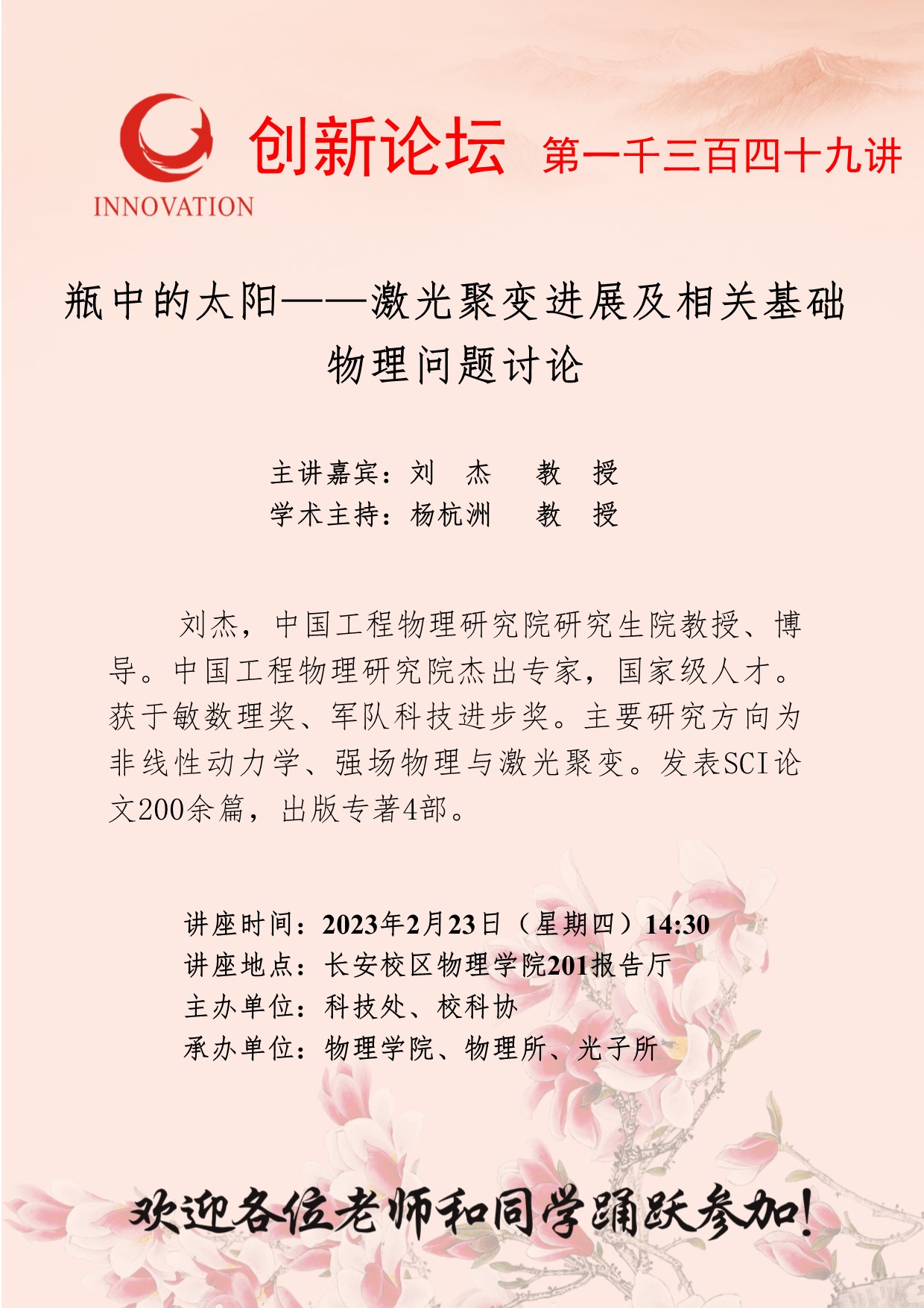 刘杰 教授 广发体育创新论坛第一千三百四十九讲:瓶中的太阳——激光聚变进展及相关基础物理问题讨论 讲座时间 2023年2月23日(星期四)14:30 讲座地点 长安校区物理学院201报告厅 讲座人介绍 刘杰 教授 讲座内容