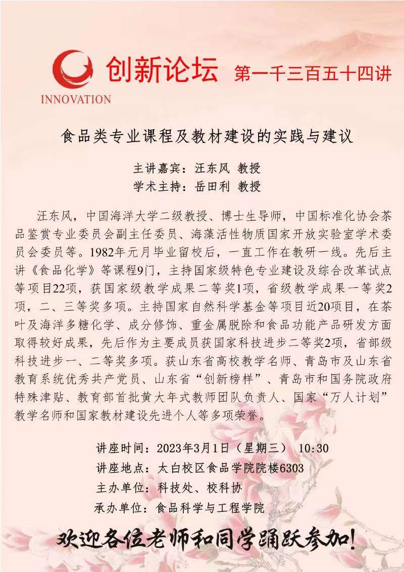 汪东风 教授 广发体育创新论坛第一千三百五十四讲:食品类专业课程及教材建设的实践与建议 讲座时间 2023年3月1日(星期三) 10:30 讲座地点 太白校区食品学院院楼6303 讲座人介绍 汪东风 教授 讲座内容