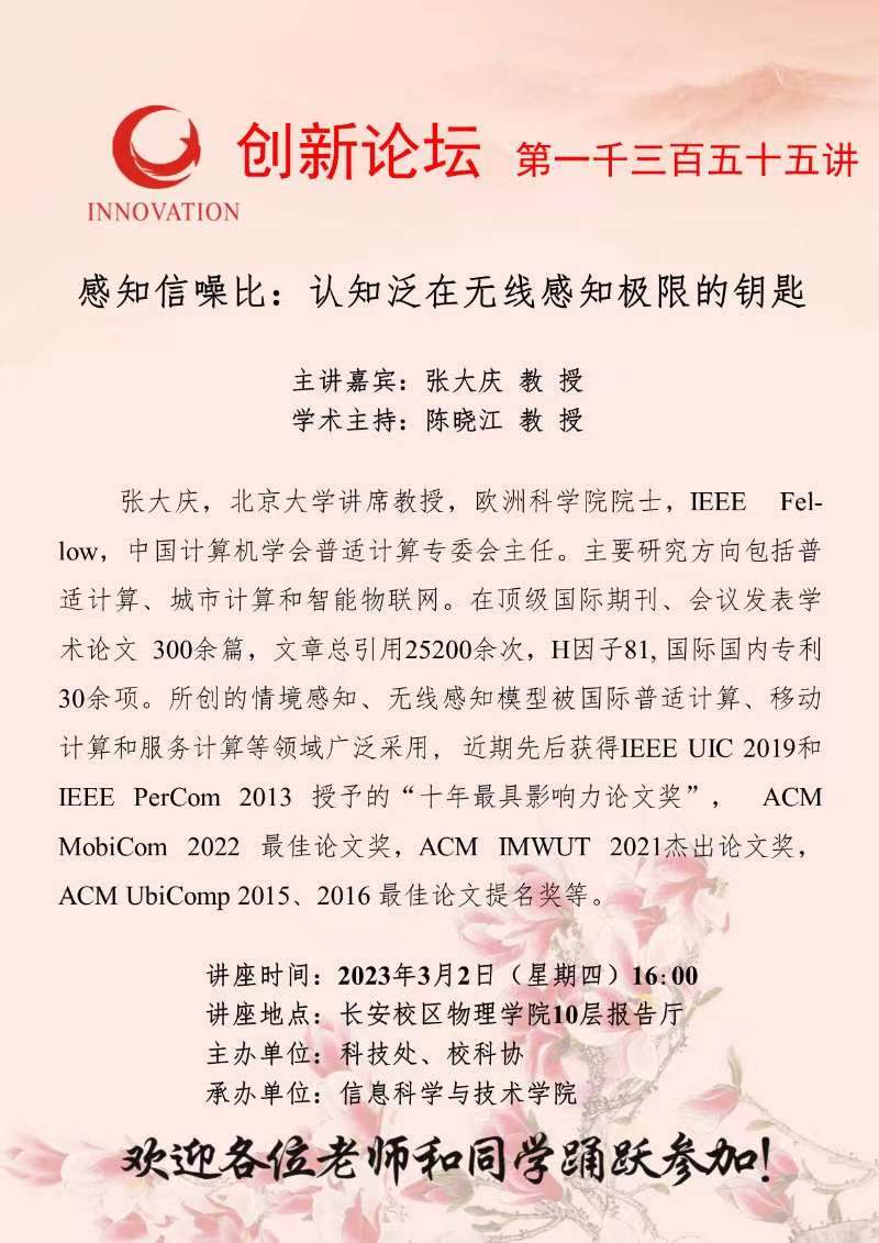 张大庆 教授 广发体育创新论坛第一千三百五十五讲:感知信噪比:认知泛在无线感知极限的钥匙 讲座时间 2023年3月2日(星期四)16:00 讲座地点 长安校区物理学院10层报告厅 讲座人介绍 张大庆 教授 讲座内容