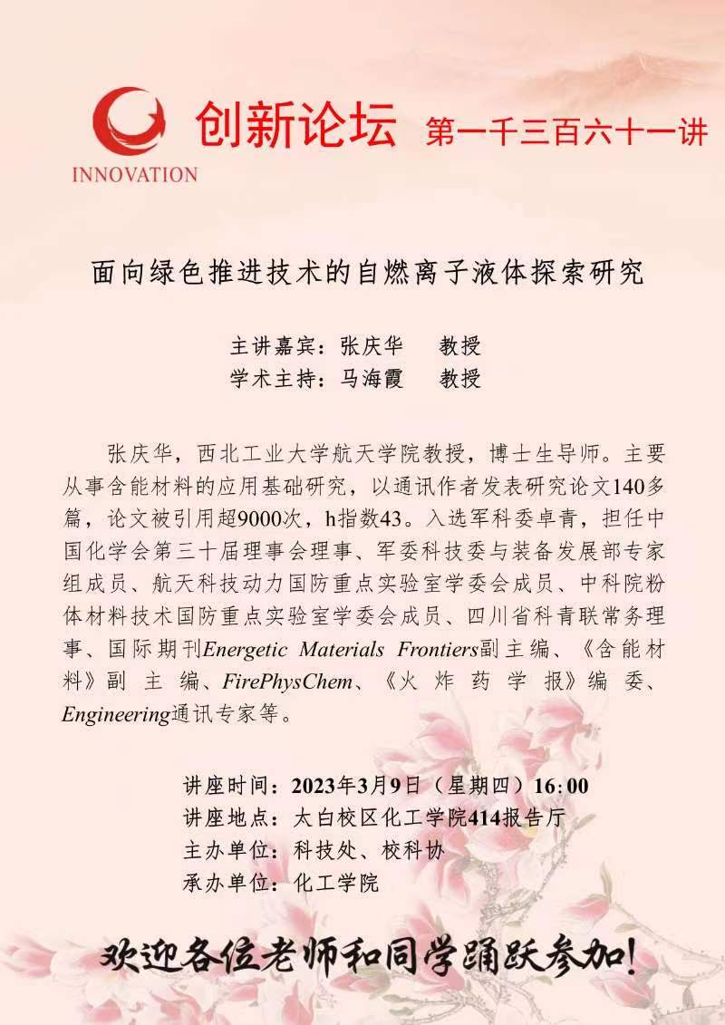 张庆华 教授 广发体育创新论坛第一千三百六十一讲:面向绿色推进技术的自燃离子液体探索研究 讲座时间 2023年3月9日(星期四)16:00 讲座地点 太白校区化工学院414报告厅 讲座人介绍 张庆华 教授 讲座内容