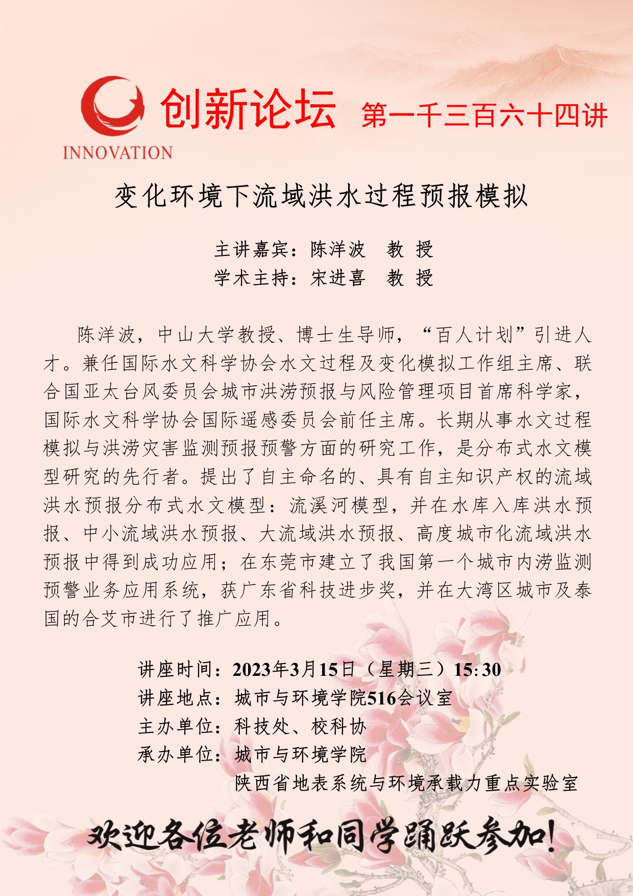 陈洋波 教授 广发体育创新论坛第一千三百六十四讲:变化环境下流域洪水过程预报模拟 讲座时间 2023年3月15日(星期三)15:30 讲座地点 城市与环境学院516会议室 讲座人介绍 陈洋波 教授 讲座内容