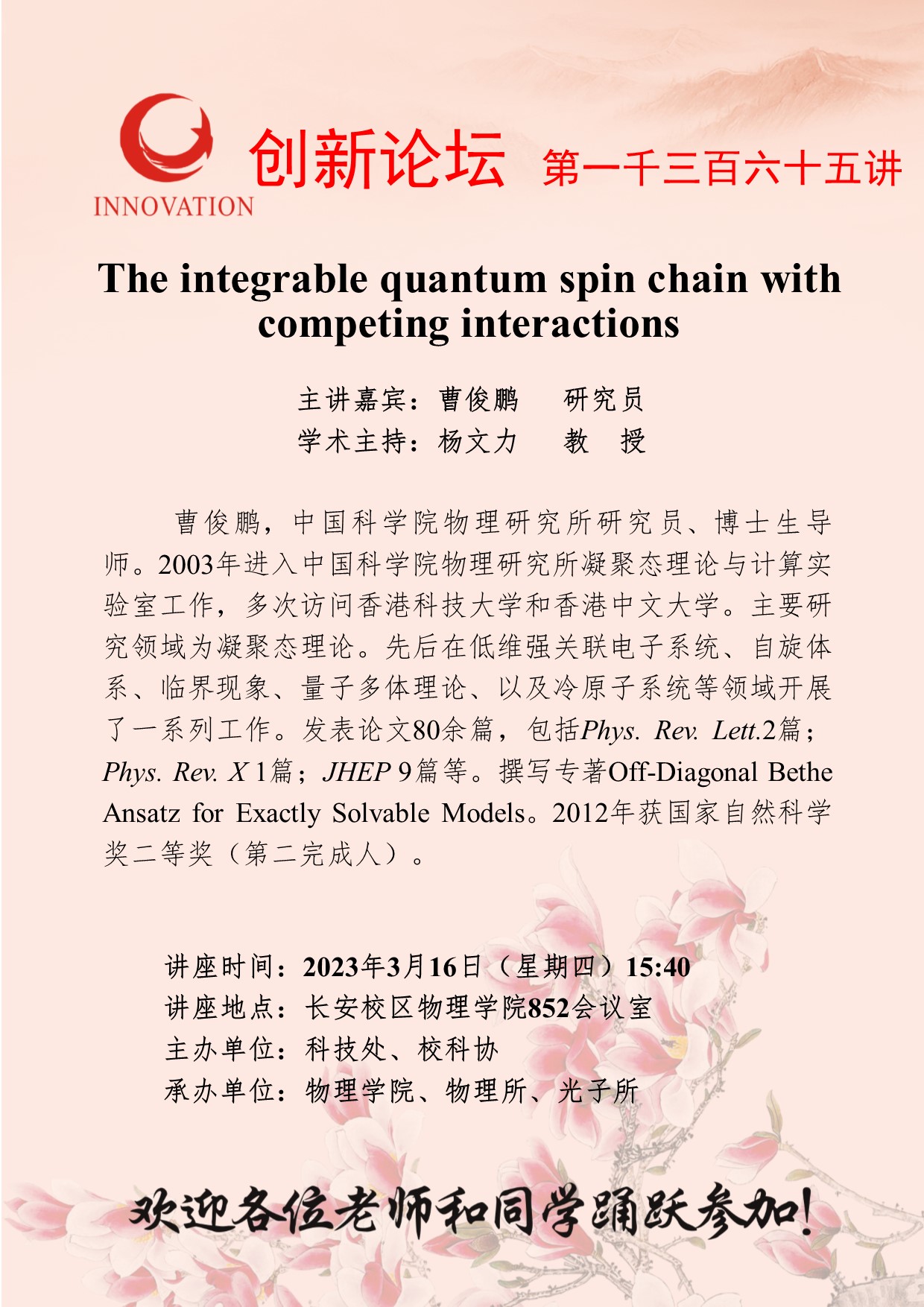 曹俊鹏 研究员 广发体育创新论坛第一千三百六十五讲:The integrable quantum spin chain with competing interactions 讲座时间 2023年3月16日(星期四)15:40 讲座地点 长安校区物理学院852会议室 讲座人介绍 曹俊鹏 研究员 讲座内容