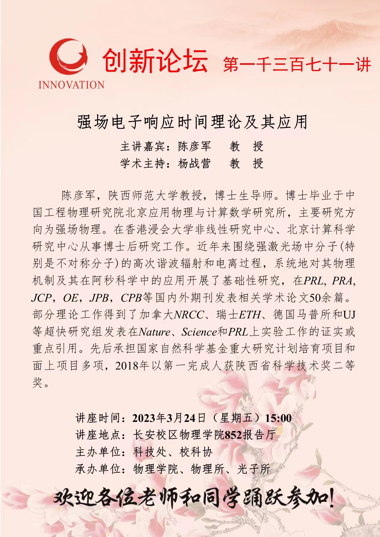 陈彦军 教 授 广发体育创新论坛第一千三百七十一讲:强场电子响应时间理论及其应用 讲座时间 2023年3月24日(星期五)15:00 讲座地点 长安校区物理学院852报告厅 讲座人介绍 陈彦军 教 授 讲座内容