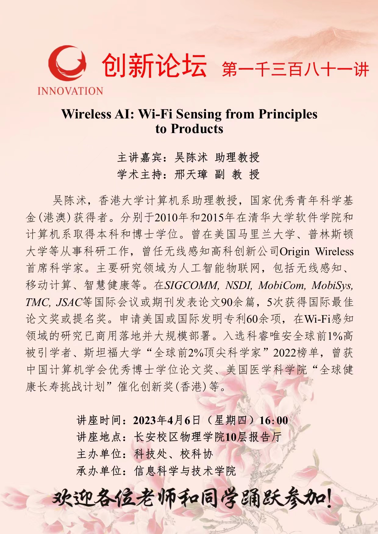 吴陈沭 助理教授 广发体育创新论坛第一千三百八十一讲:Wireless AI: Wi-Fi Sensing from Principles to Products 讲座时间 2023年4月6日(星期四)16:00 讲座地点 长安校区物理学院10层报告厅 讲座人介绍 吴陈沭 助理教授 讲座内容