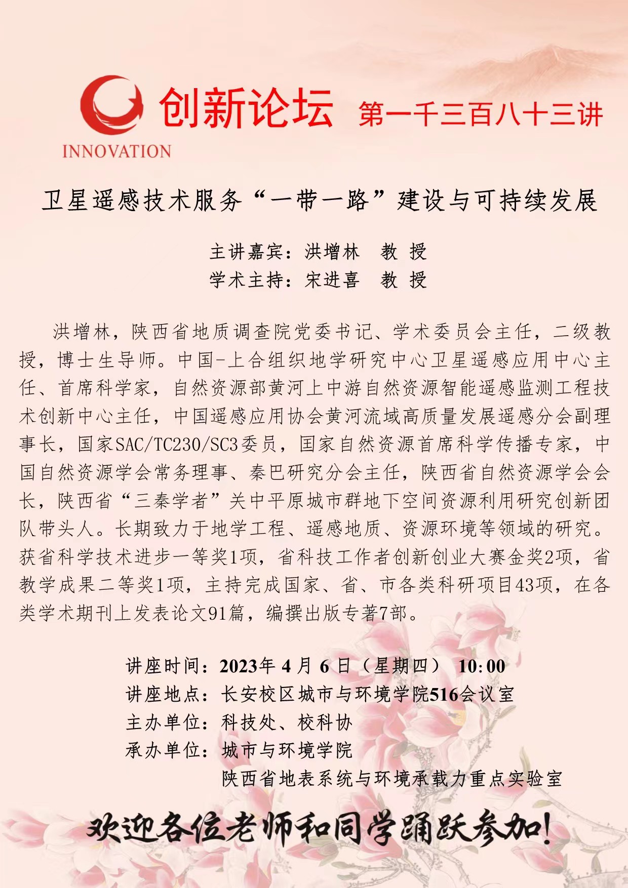 洪增林 教 授 广发体育创新论坛第一千三百八十三讲:卫星遥感技术服务“一带一路”建设与可持续发展 讲座时间 2023年 4 月 6 日(星期四) 10:00 讲座地点 长安校区城市与环境学院516会议室 讲座人介绍 洪增林 教 授 讲座内容