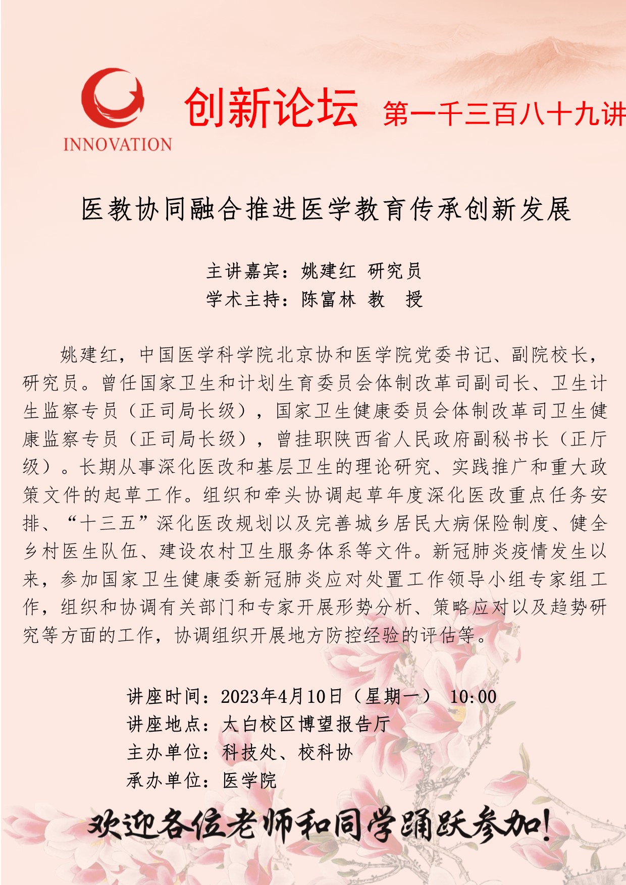 姚建红 研究员 广发体育创新论坛第一千三百八十九讲:医教协同融合推进医学教育传承创新发展 讲座时间 2023年4月10日(星期一) 10:00 讲座地点 太白校区博望报告厅 讲座人介绍 姚建红 研究员 讲座内容