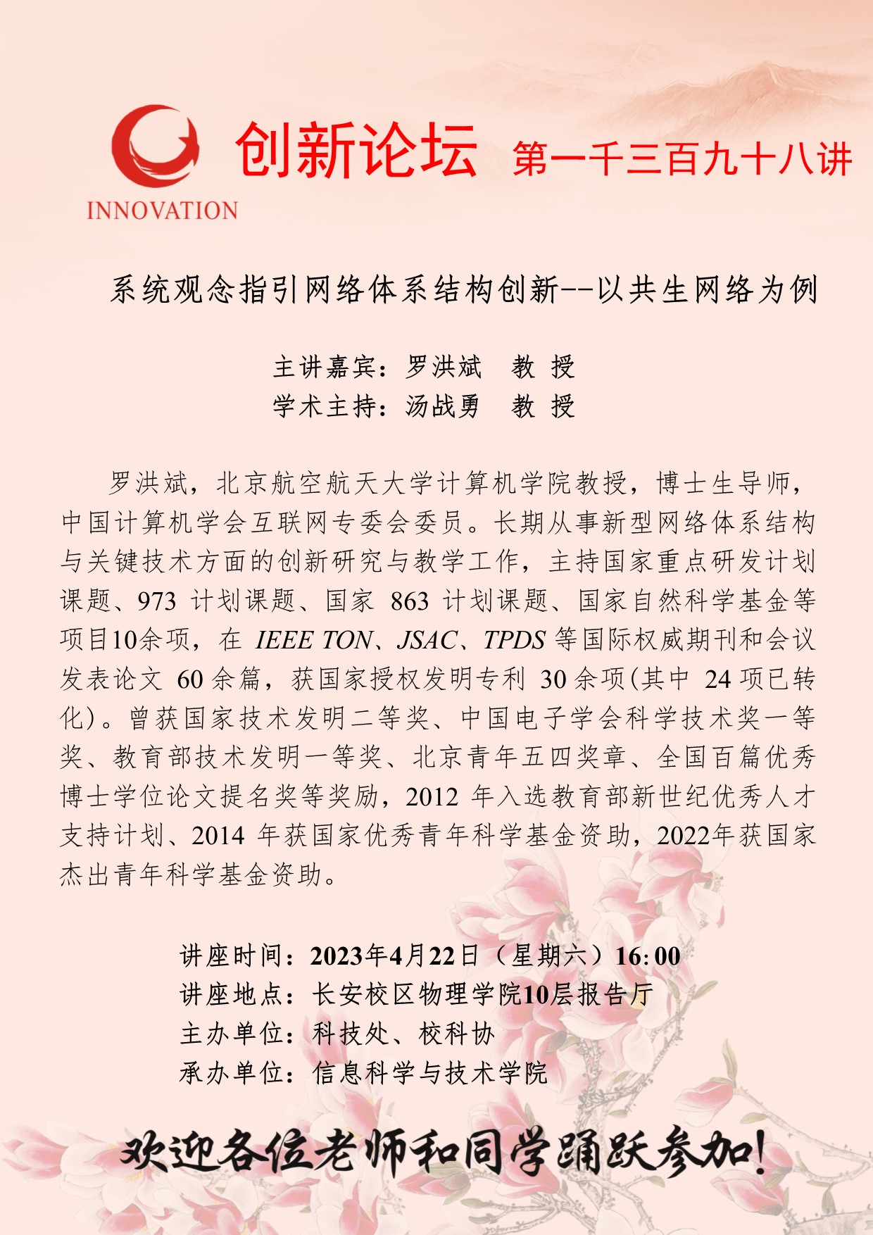 罗洪斌 教 授 广发体育创新论坛第一千三百九十八讲:系统观念指引网络体系结构创新--以共生网络为例 讲座时间 2023年4月22日(星期六)16:00 讲座地点 长安校区物理学院10层报告厅 讲座人介绍 罗洪斌 教 授 讲座内容