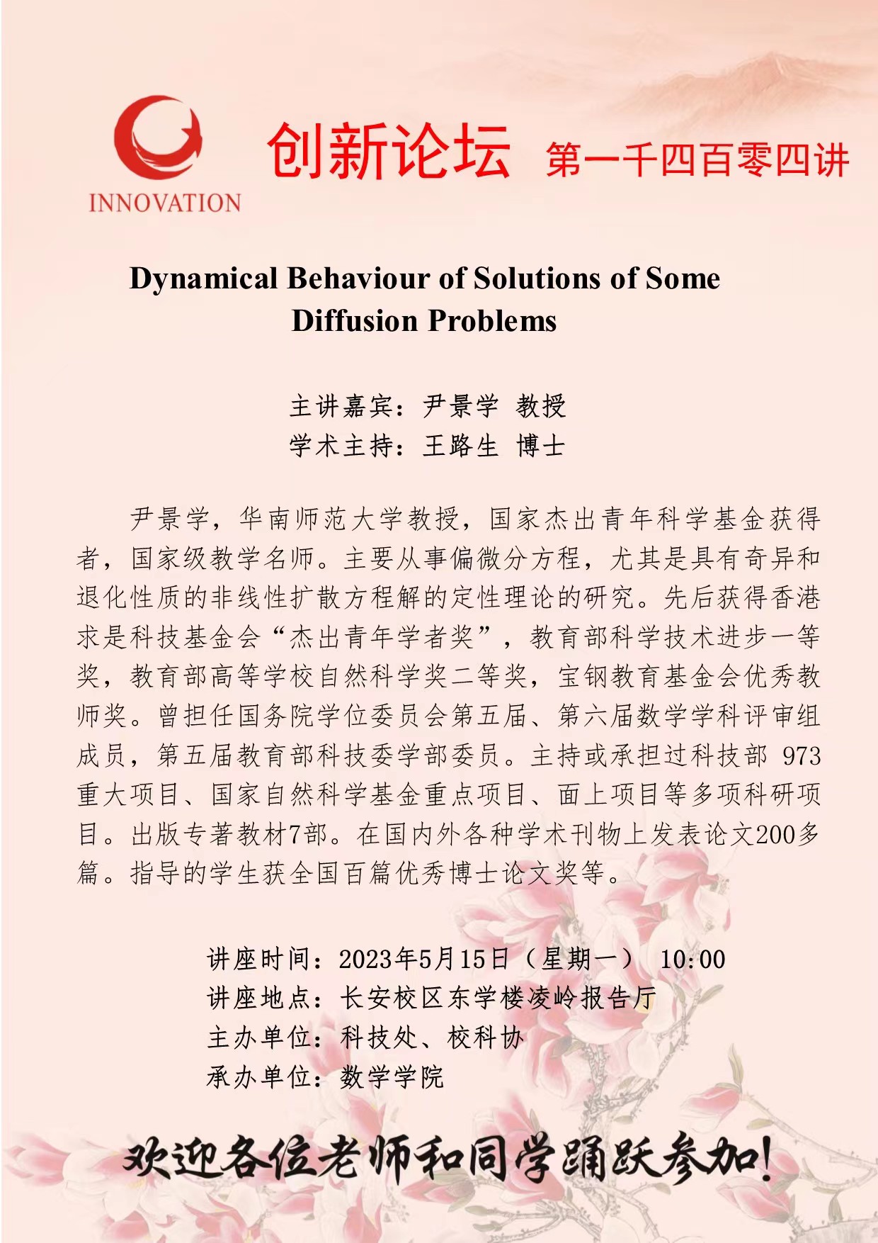 尹景学 教授 广发体育创新论坛第一千四百零四讲:Dynamical Behaviour of Solutions of Some Diffusion Problems 讲座时间 2023年5月15日(星期一) 10:00 讲座地点 长安校区东学楼凌岭报告厅 讲座人介绍 尹景学 教授 讲座内容