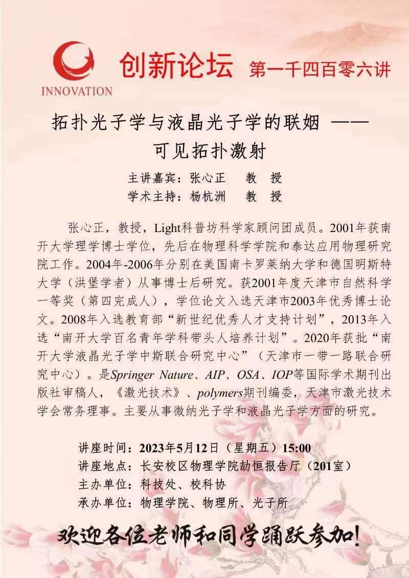 张心正 教 授 广发体育创新论坛第一千四百零六讲:拓扑光子学与液晶光子学的联姻 — 可见拓扑激射 讲座时间 2023年5月12日(星期五)15:00 讲座地点 长安校区物理学院劼恒报告厅(201室) 讲座人介绍 张心正 教 授 讲座内容