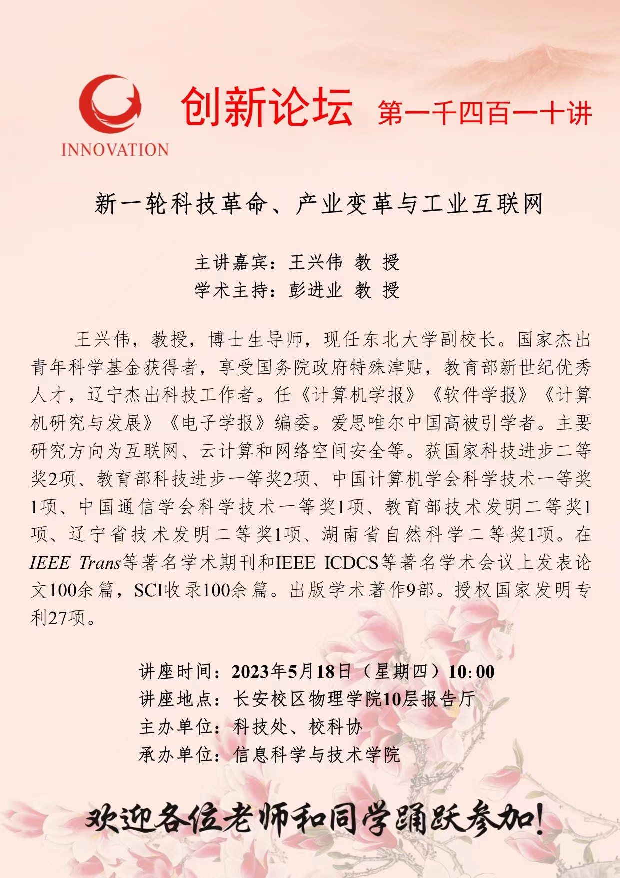 王兴伟 教 授 广发体育创新论坛第一千四百零一十讲:新一轮科技革命、产业变革与工业互联网 讲座时间 2023年5月18日(星期四)10:00 讲座地点 长安校区物理学院10层报告厅 讲座人介绍 王兴伟 教 授 讲座内容