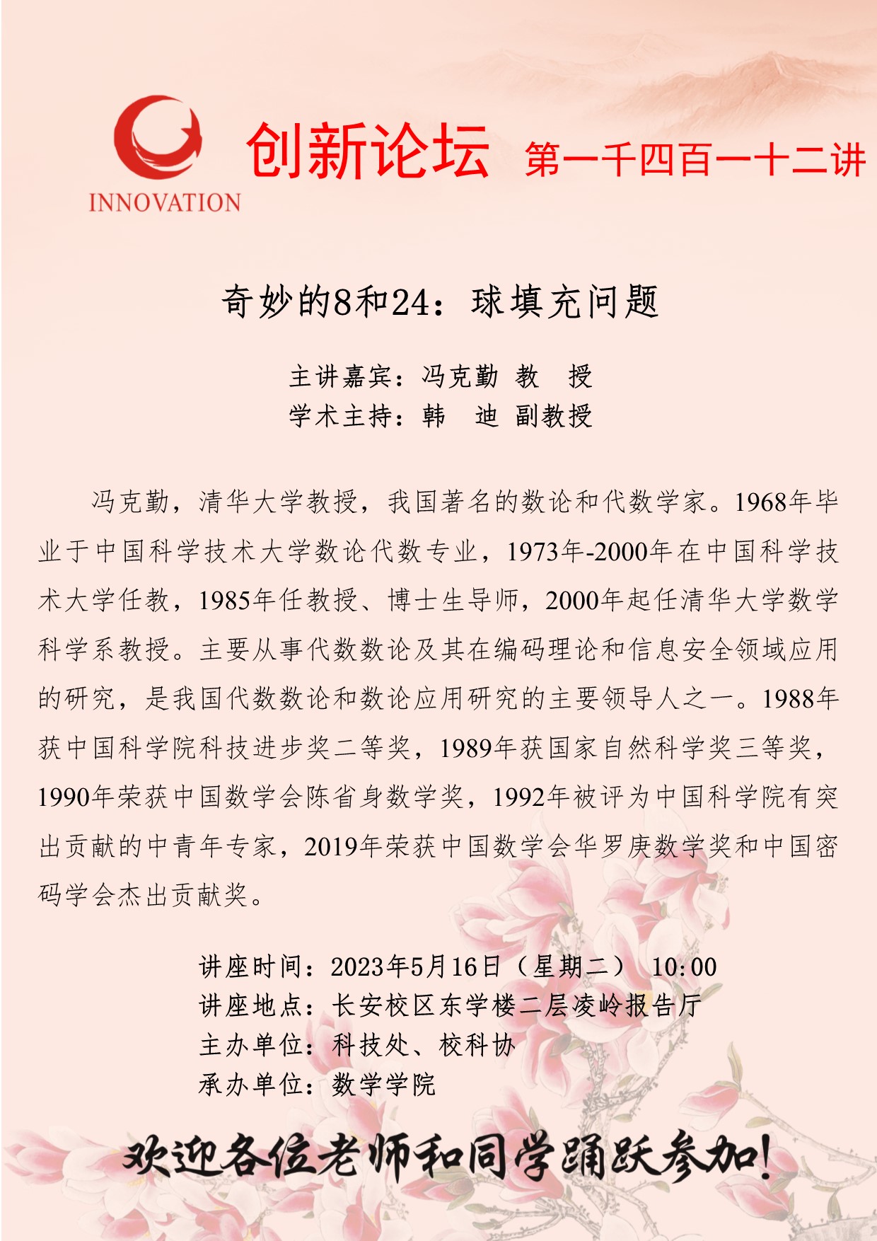 冯克勤 教授 广发体育创新论坛第一千四百一十二讲:奇妙的8和24:球填充问题 讲座时间 2023年5月16日(星期二)10:00 讲座地点 长安校区东学楼二层凌岭报告厅 讲座人介绍 冯克勤 教授 讲座内容