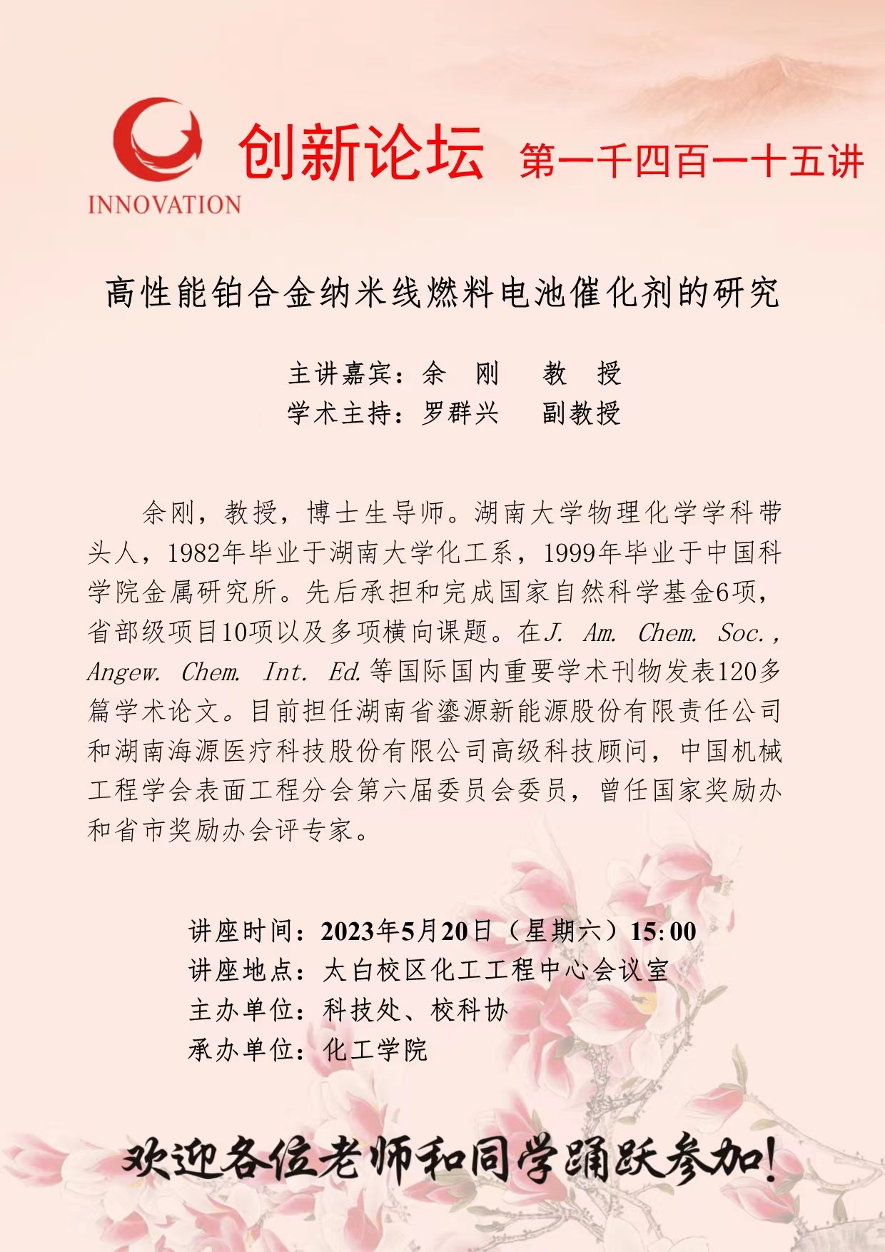 余 刚 教 授 广发体育创新论坛第一千四百一十五讲:高性能铂合金纳米线燃料电池催化剂的研究 讲座时间 2023年5月20日(星期六)15:00 讲座地点 太白校区化工工程中心会议室 讲座人介绍 余 刚 教 授 讲座内容