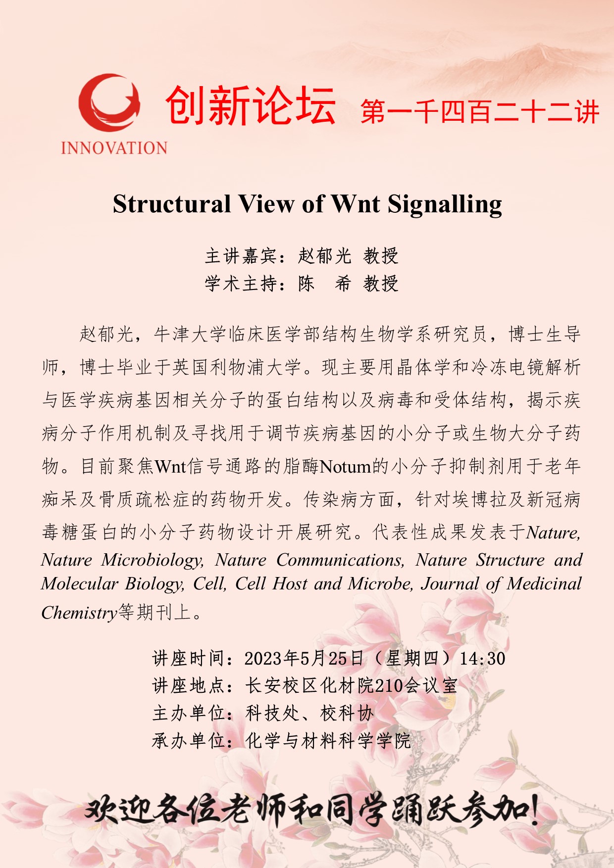 赵郁光 教授 广发体育创新论坛第一千四百二十二讲:Structural View of Wnt Signalling 讲座时间 2023年5月25日(星期四)14:30 讲座地点 长安校区化材院210会议室 讲座人介绍 赵郁光 教授 讲座内容