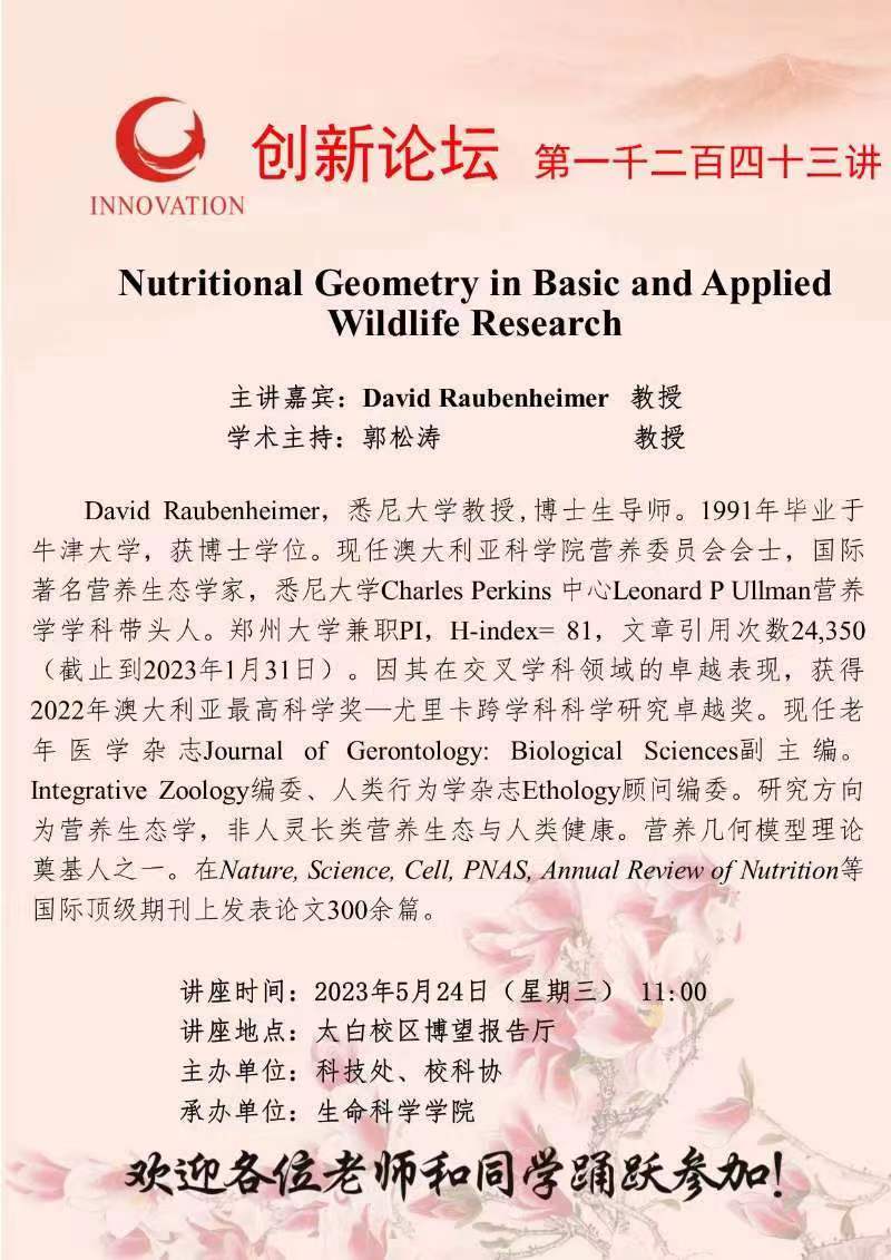 David Raubenheimer 教授 广发体育创新论坛第一千四百二十四讲:Nutritional Geometry in Basic and Applied Wildlife Research 讲座时间 2023年5月24日(星期三)11:00 讲座地点 太白校区博望报告厅 讲座人介绍 David Raubenheimer 教授 讲座内容