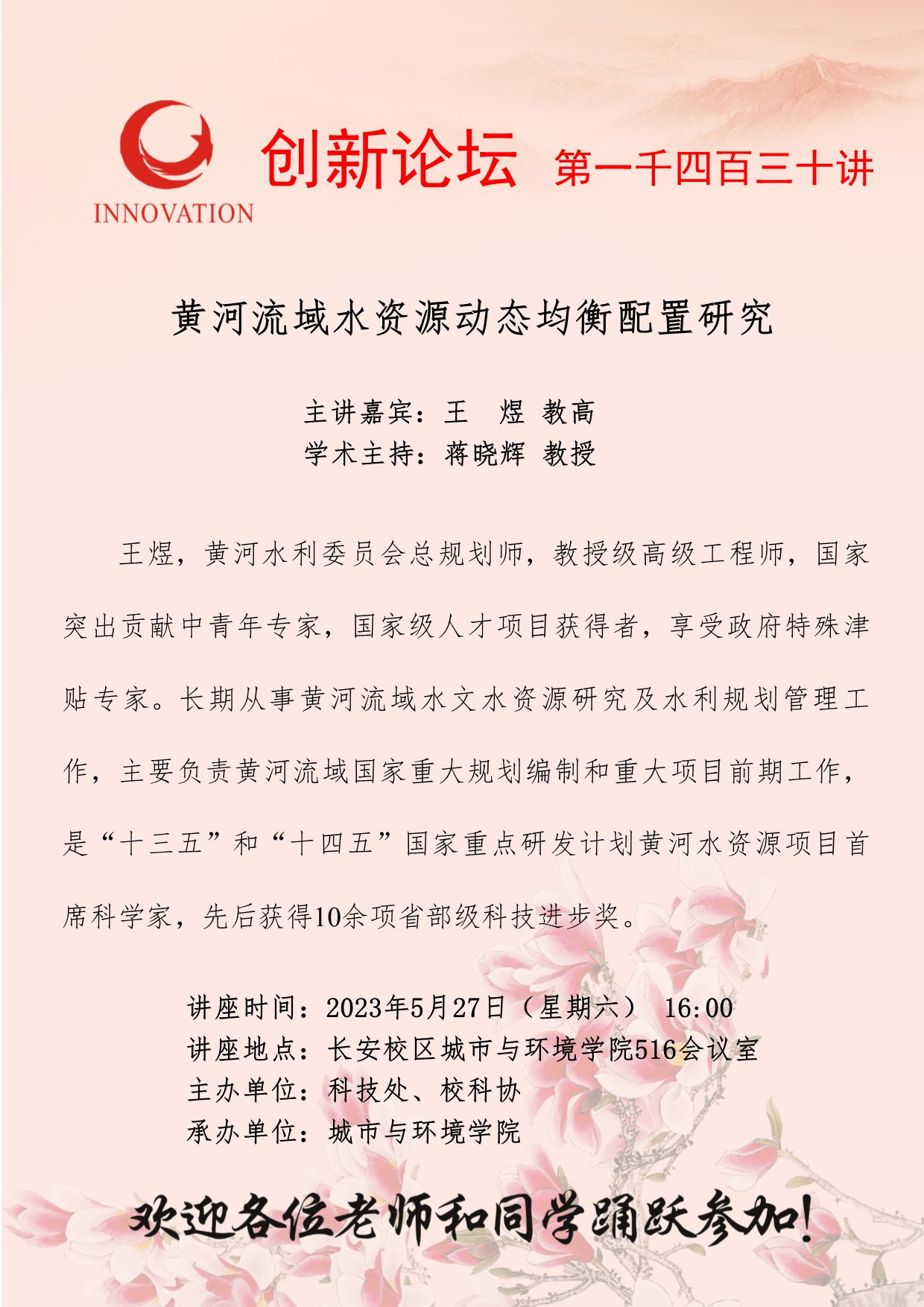 王 煜 教高 广发体育创新论坛第一千四百三十讲:黄河流域水资源动态均衡配置研究 讲座时间 2023年5月27日(星期六) 16:00 讲座地点 长安校区城市与环境学院516会议室 讲座人介绍 王 煜 教高 讲座内容