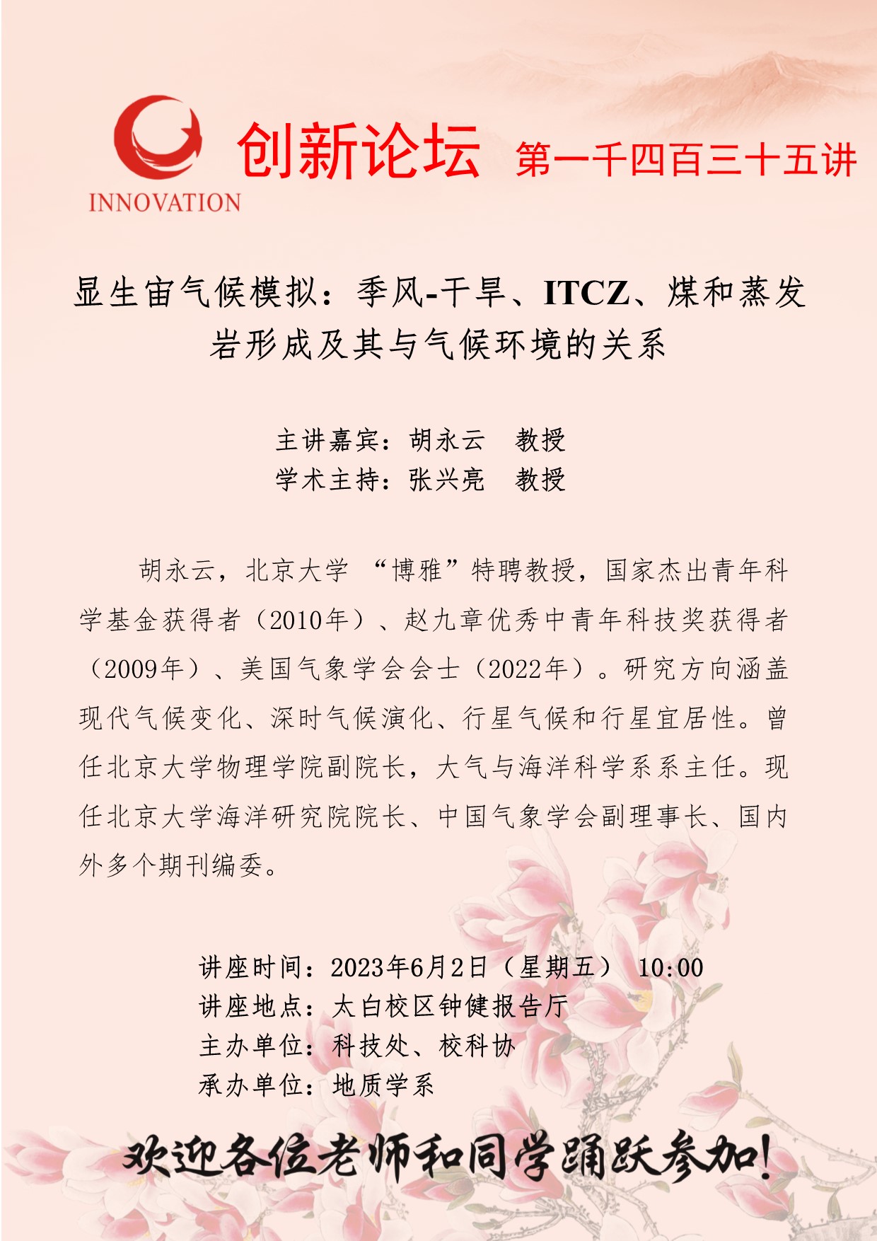 胡永云 教授 广发体育创新论坛第一千四百三十五讲:显生宙气候模拟:季风-干旱、ITCZ、煤和蒸发岩形成及其与气候环境的关系 讲座时间 2023年6月2日(星期五) 10:00 讲座地点 太白校区钟健报告厅 讲座人介绍 胡永云 教授 讲座内容