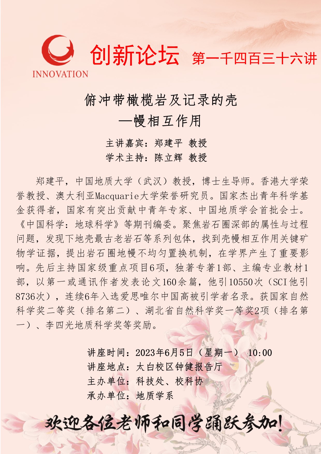 郑建平 教授 广发体育创新论坛第一千四百三十六讲:俯冲带橄榄岩及记录的壳—幔相互作用 讲座时间 2023年6月5日(星期一) 10:00 讲座地点 太白校区钟健报告厅 讲座人介绍 郑建平 教授 讲座内容