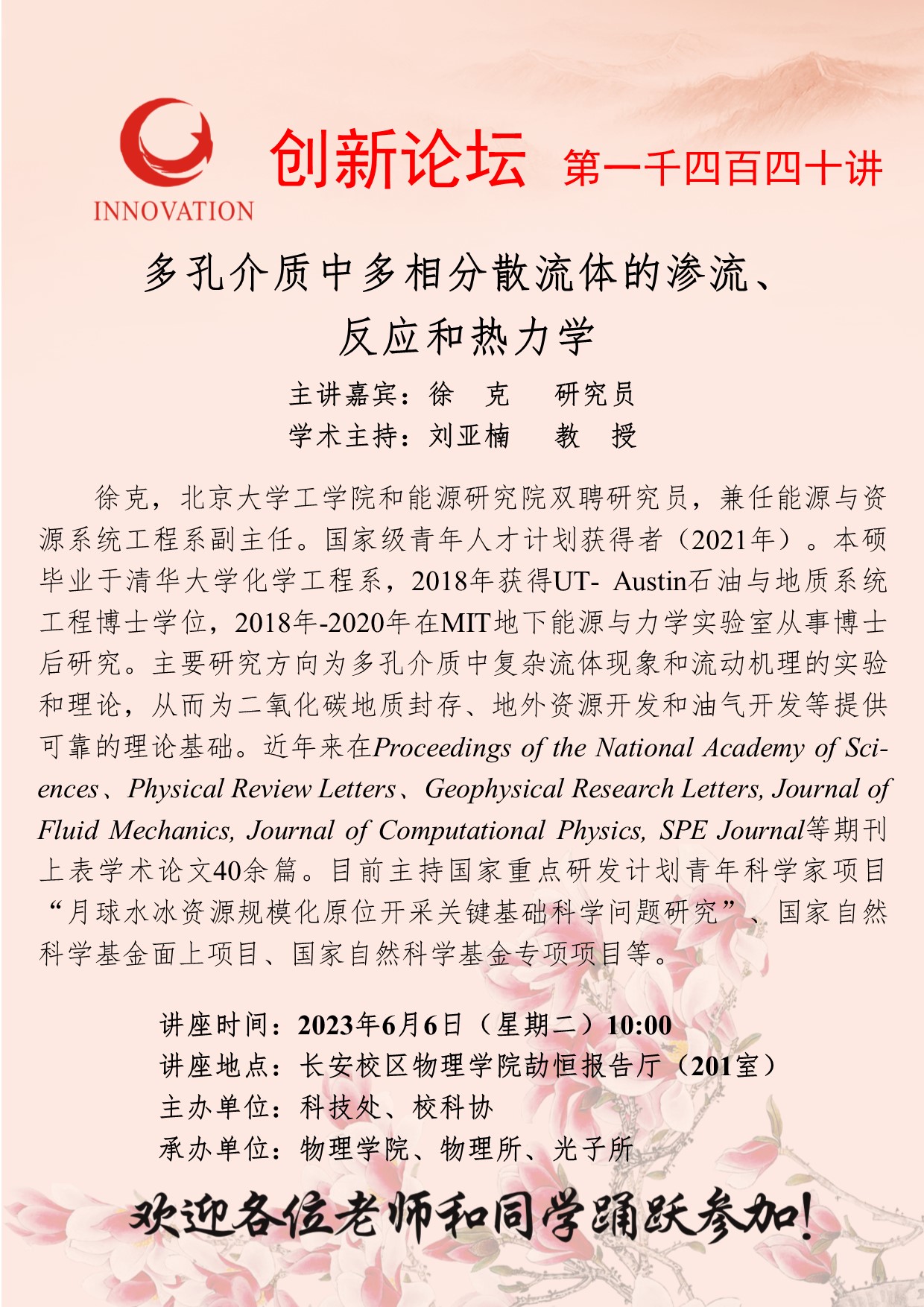 徐克 研究员 广发体育创新论坛第一千四百四十讲:多孔介质中多相分散流体的渗流、反应和热力学 讲座时间 2023年6月6日(星期二)10:00 讲座地点 长安校区物理学院劼恒报告厅(201室) 讲座人介绍 徐克 研究员 讲座内容