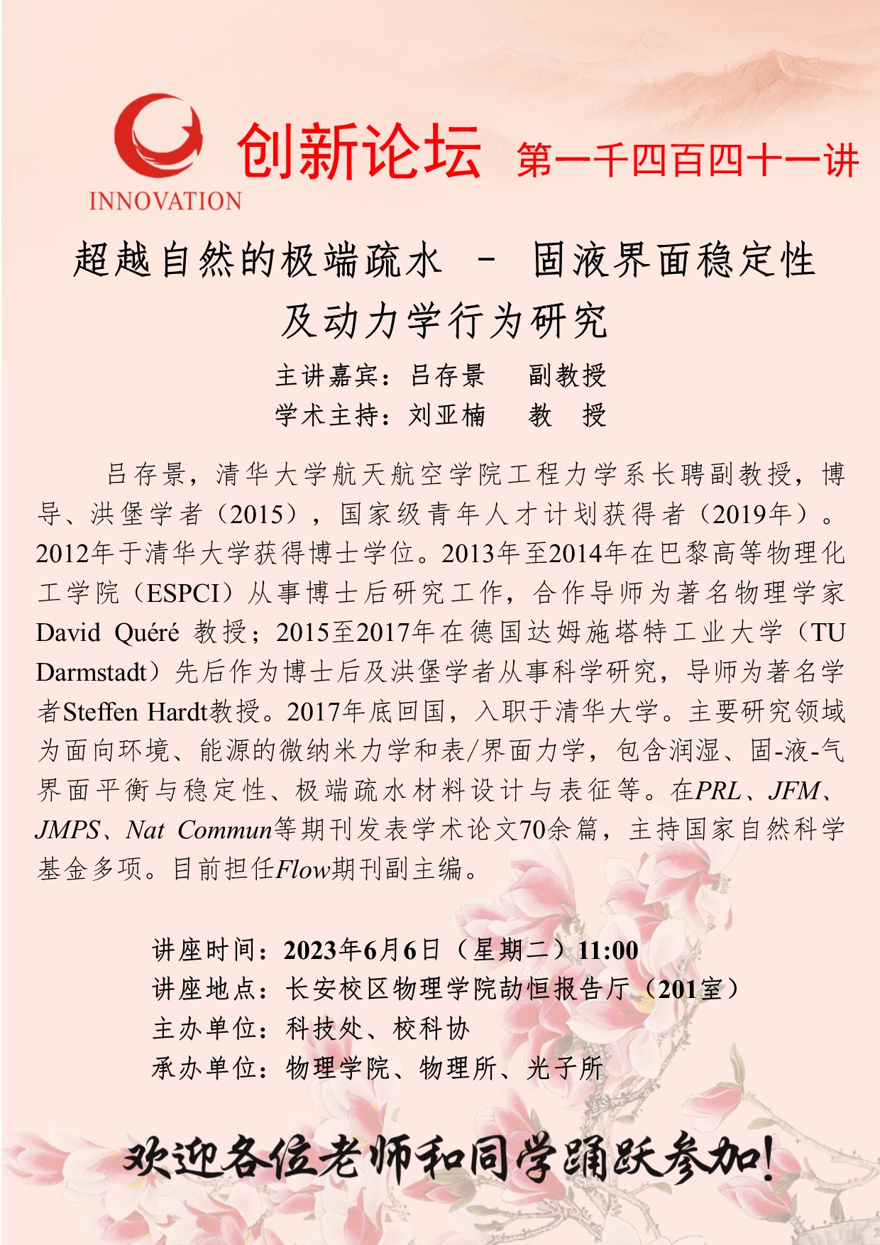 吕存景 副教授 广发体育创新论坛第一千四百四十一讲:超越自然的极端疏水 – 固液界面稳定性及动力学行为研究 讲座时间 2023年6月6日(星期二)11:00 讲座地点 长安校区物理学院劼恒报告厅(201室) 讲座人介绍 吕存景 副教授 讲座内容