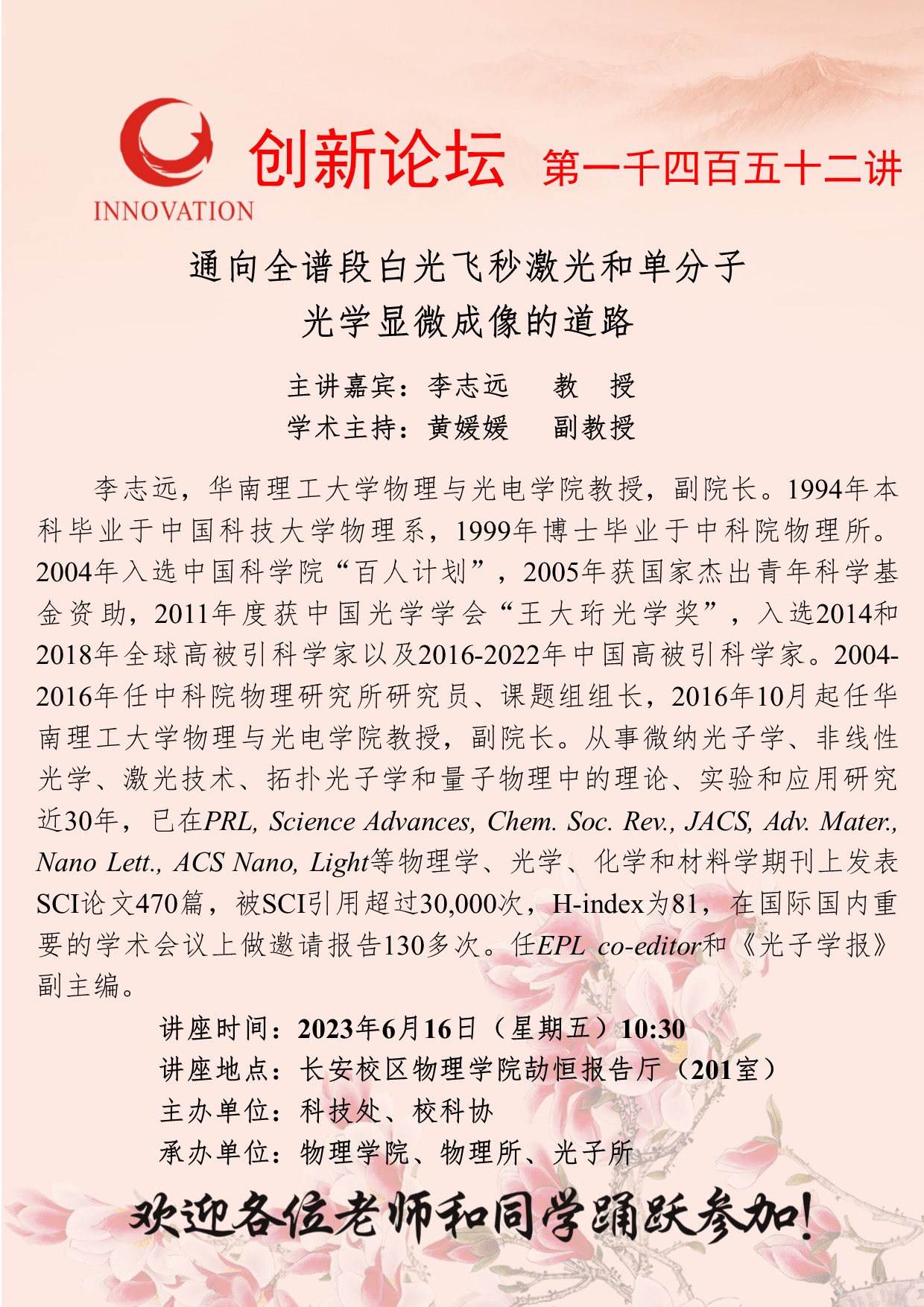李志远 教授 广发体育创新论坛第一千四百五十二讲:通向全谱段白光飞秒激光和单分子光学显微成像的道路 讲座时间 2023年6月16日(星期五)10:30 讲座地点 长安校区物理学院劼恒报告厅(201室) 讲座人介绍 李志远 教授 讲座内容