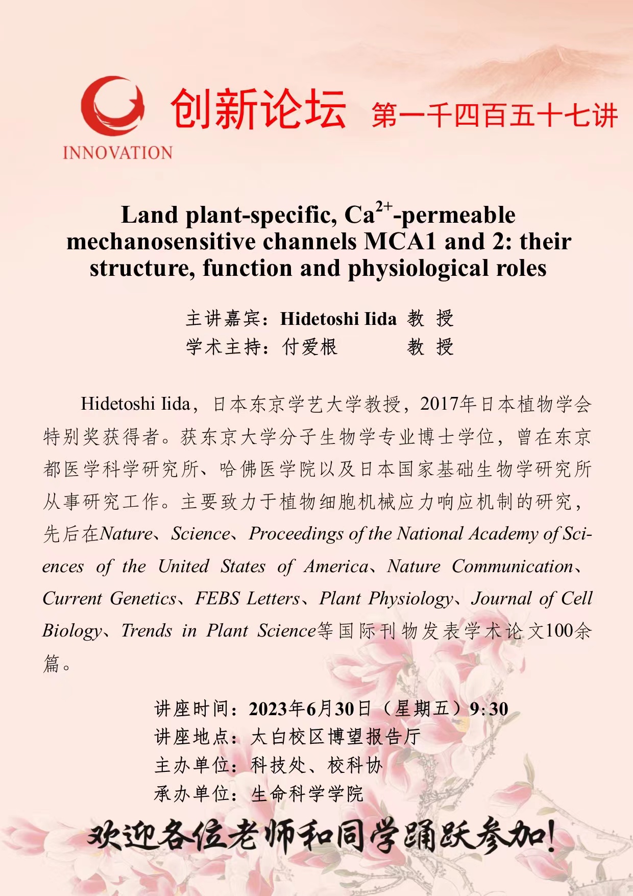 Hidetoshi Iida 教授 广发体育创新论坛第一千四百五十七讲:Land plant-specific, Ca2+-permeable mechanosensitive channels MCA1 and 2: their structure, function and physiological roles 讲座时间 2023年6月30日(星期五)9:30 讲座地点 太白校区博望报告厅 讲座人介绍 Hidetoshi Iida 教授 讲座内容