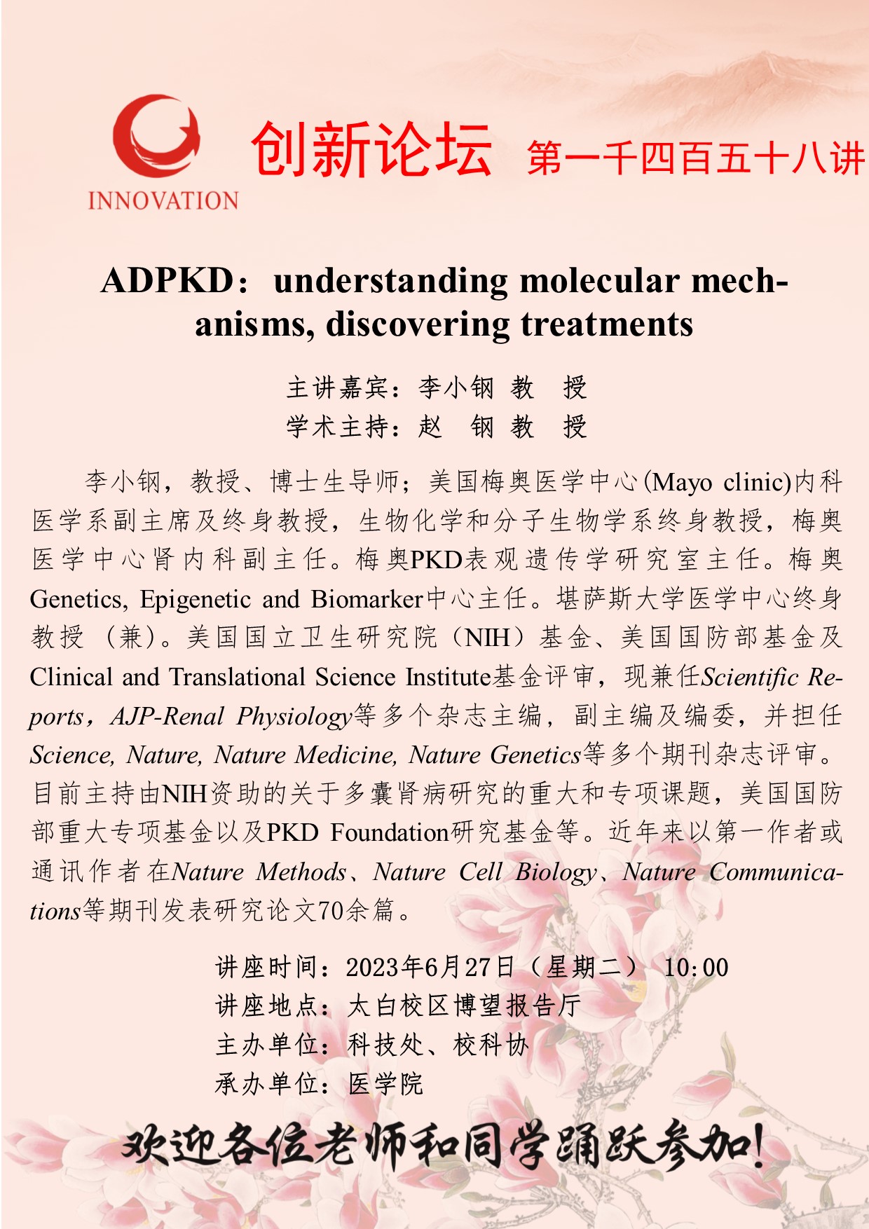 李小钢 教 授 广发体育创新论坛第一千四百五十八讲:ADPKD:understanding molecular mechanisms, discovering treatments 讲座时间 2023年6月27日(星期二) 10:00 讲座地点 太白校区博望报告厅 讲座人介绍 李小钢 教 授 讲座内容