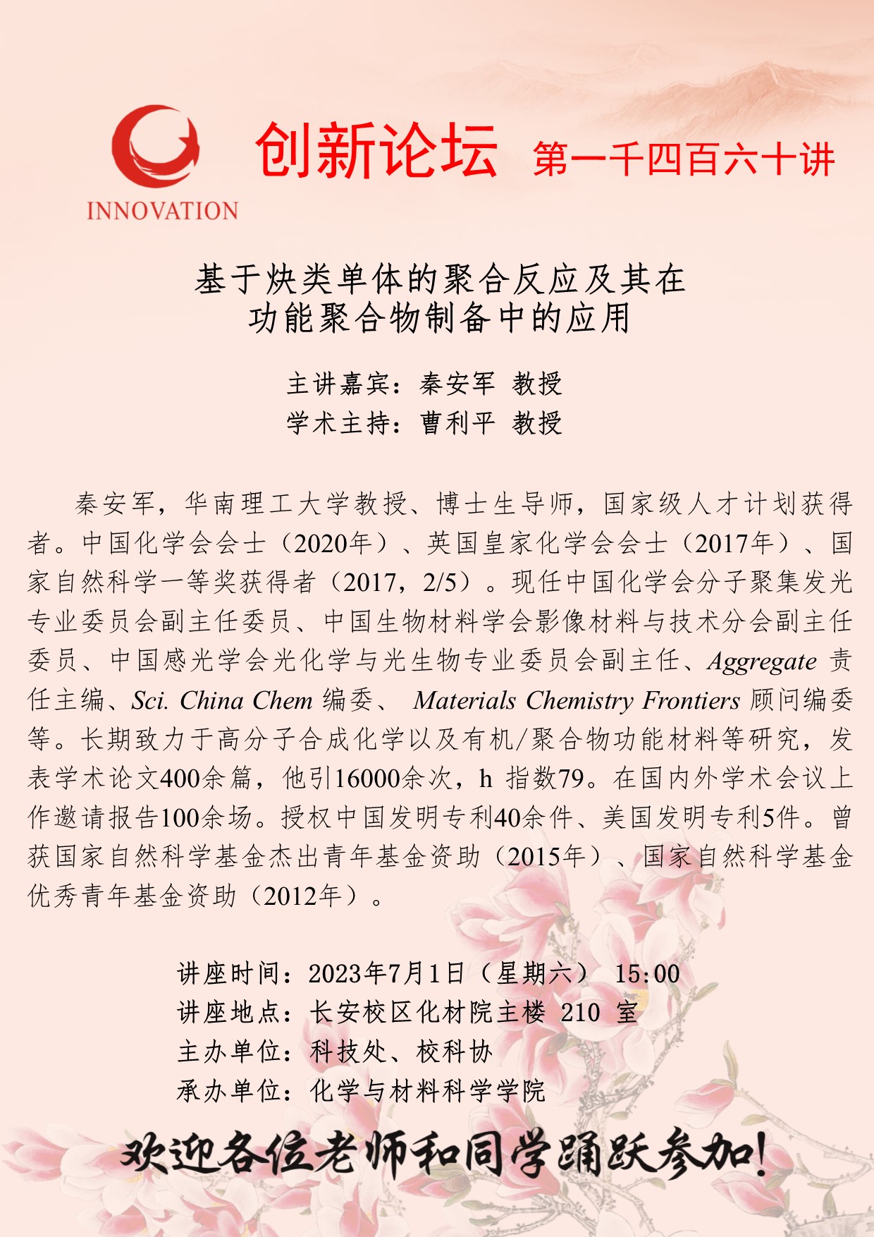 秦安军 教授 广发体育创新论坛第一千四百六十讲:基于炔类单体的聚合反应及其在功能聚合物制备中的应用 讲座时间 2023年7月1日(星期六) 15:00 讲座地点 长安校区化材院主楼 210 室 讲座人介绍 秦安军 教授 讲座内容