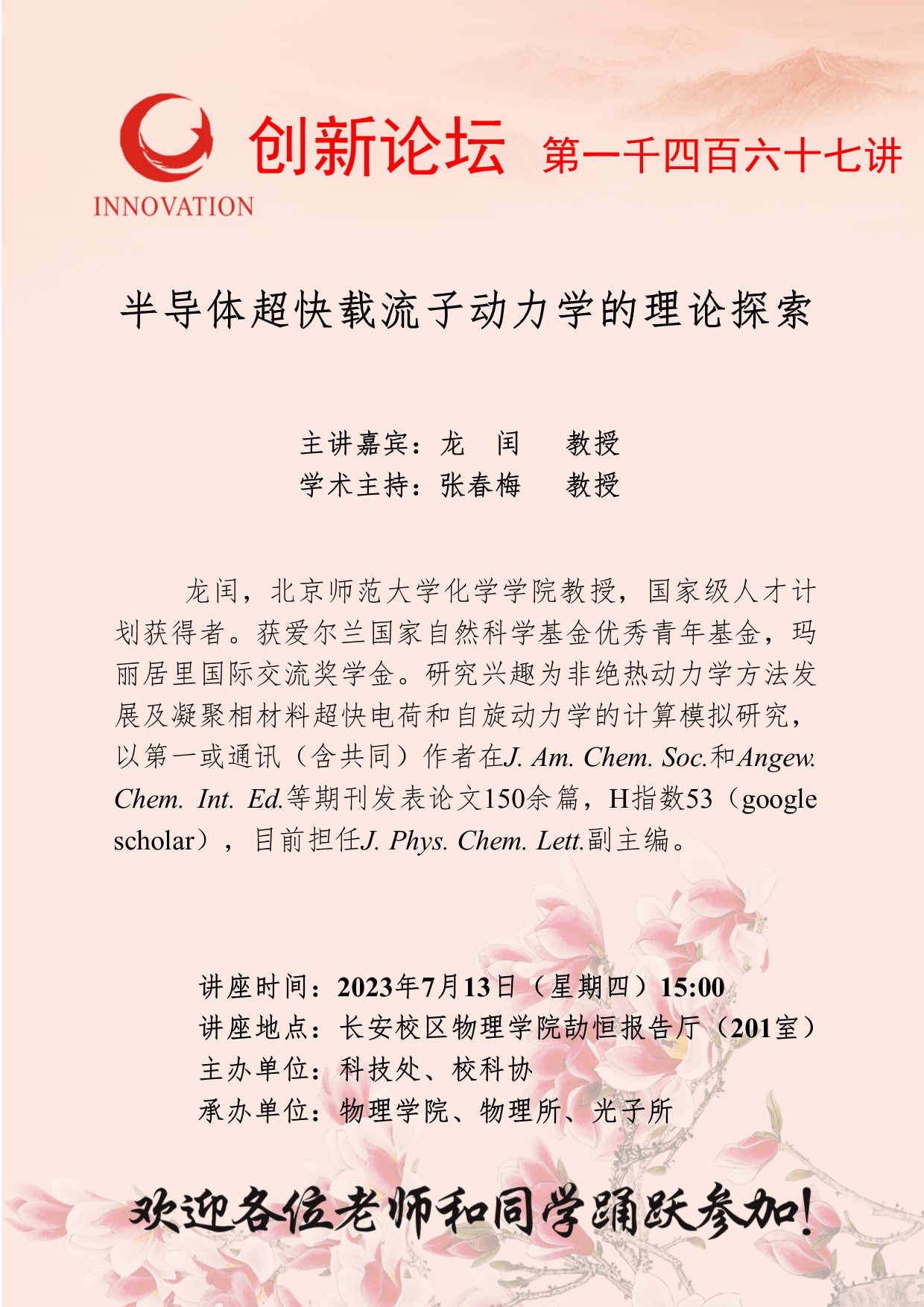 龙闰 教授 广发体育创新论坛第一千四百六十七讲:半导体超快载流子动力学的理论探索 讲座时间 2023年7月13日(星期四)15:00 讲座地点 长安校区物理学院劼恒报告厅(201室) 讲座人介绍 龙闰 教授 讲座内容
