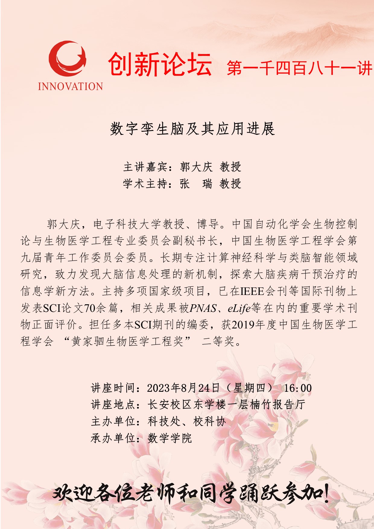 郭大庆 教授 广发体育创新论坛第一千四百八十一讲:数字孪生脑及其应用进展 讲座时间 2023年8月24日(星期四) 16:00 讲座地点 长安校区东学楼一层楠竹报告厅 讲座人介绍 郭大庆 教授 讲座内容