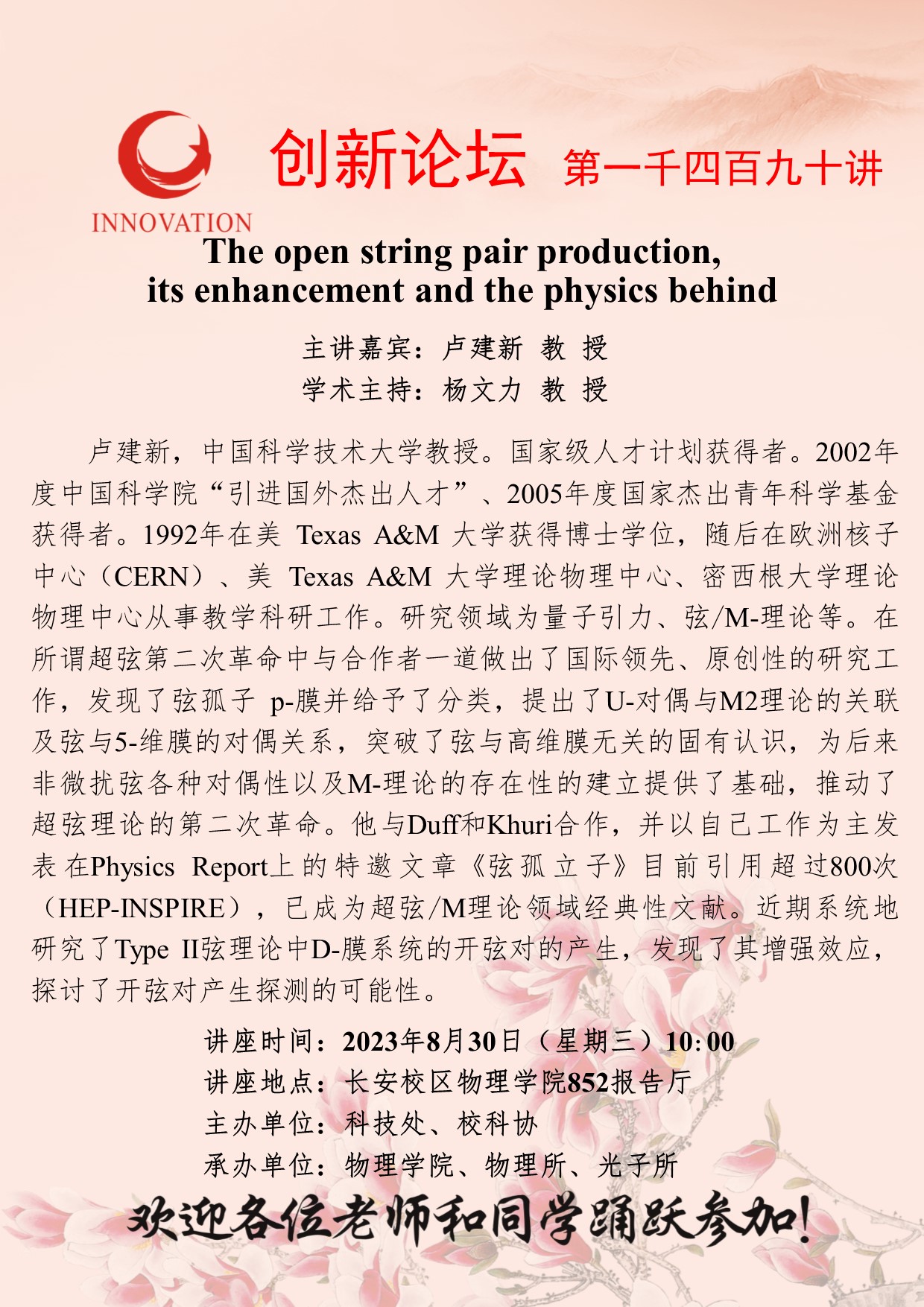 卢建新 教授 广发体育创新论坛第一千四百九十讲:The open string pair production, its enhancement and the physics behind 讲座时间 2023年8月30日(星期三)10:00 讲座地点 长安校区物理学院852报告厅 讲座人介绍 卢建新 教授 讲座内容