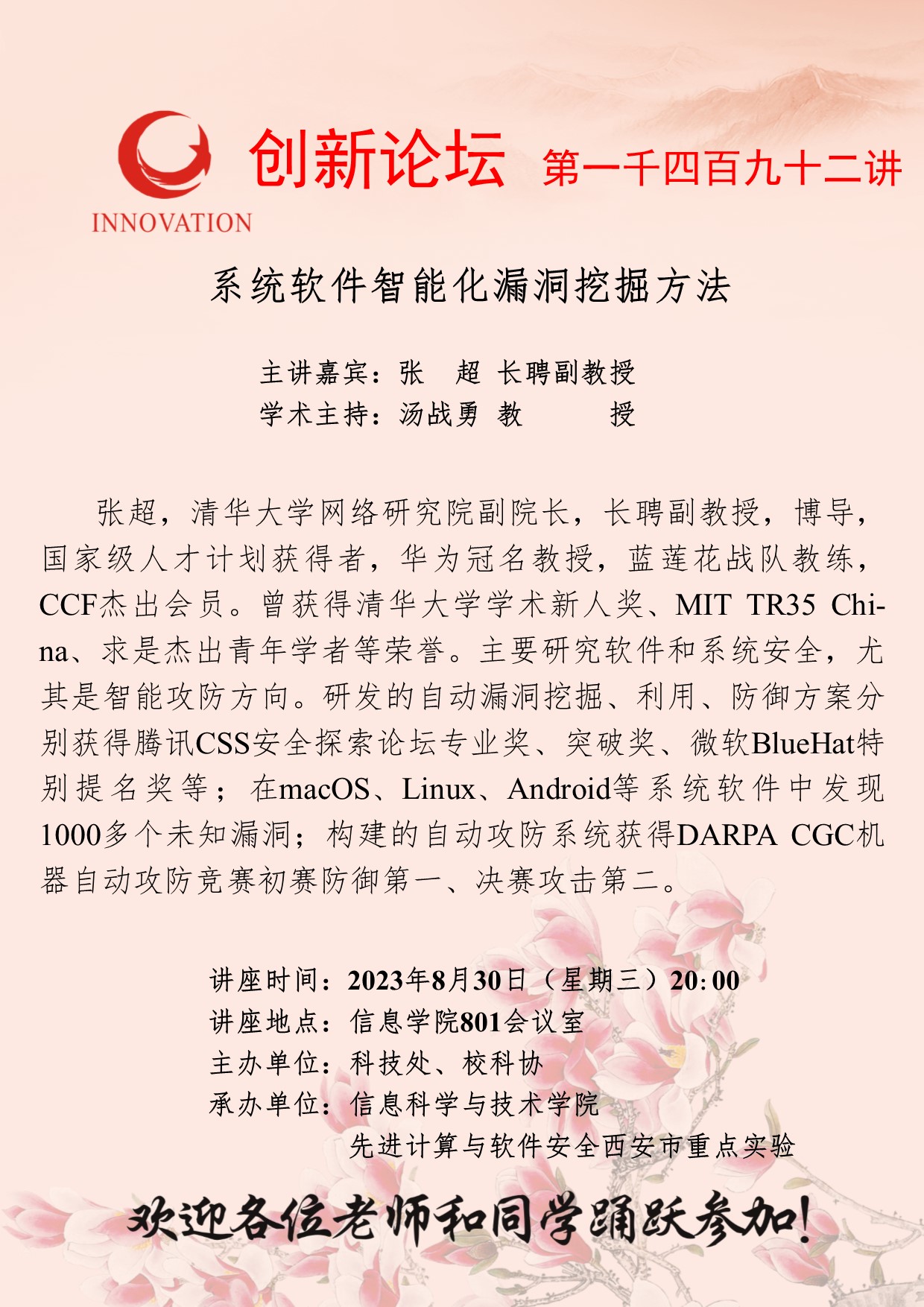 张超 长聘副教授 广发体育创新论坛第一千四百九十二讲:系统软件智能化漏洞挖掘方法 讲座时间 2023年8月30日(星期三)20:00 讲座地点 信息学院801会议室 讲座人介绍 张超 长聘副教授 讲座内容