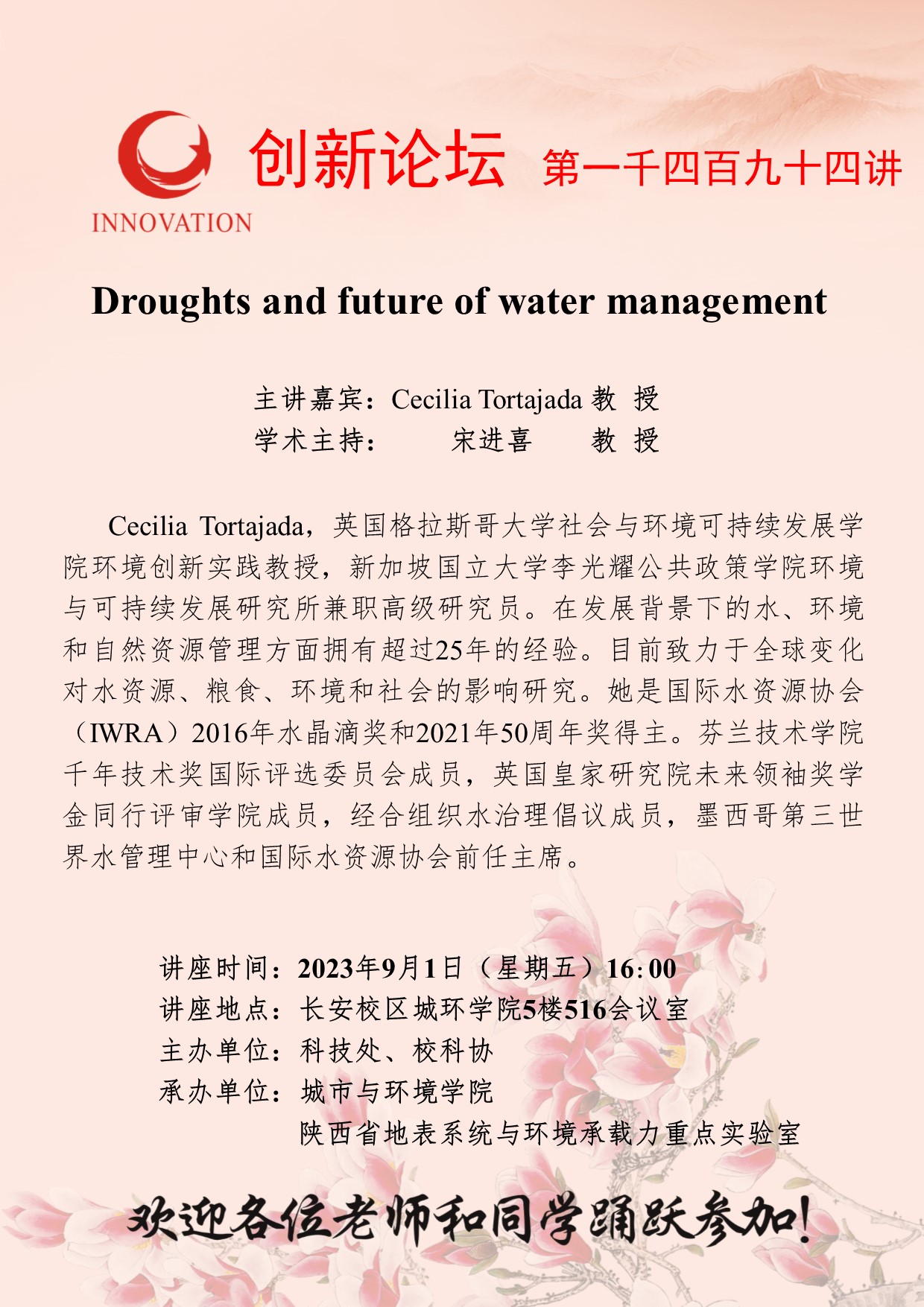 Cecilia Tortajada 教 授 广发体育创新论坛第一千四百九十四讲:Droughts and future of water management 讲座时间 2023年9月1日(星期五)16:00 讲座地点 长安校区城环学院5楼516会议室 讲座人介绍 Cecilia Tortajada 教 授 讲座内容