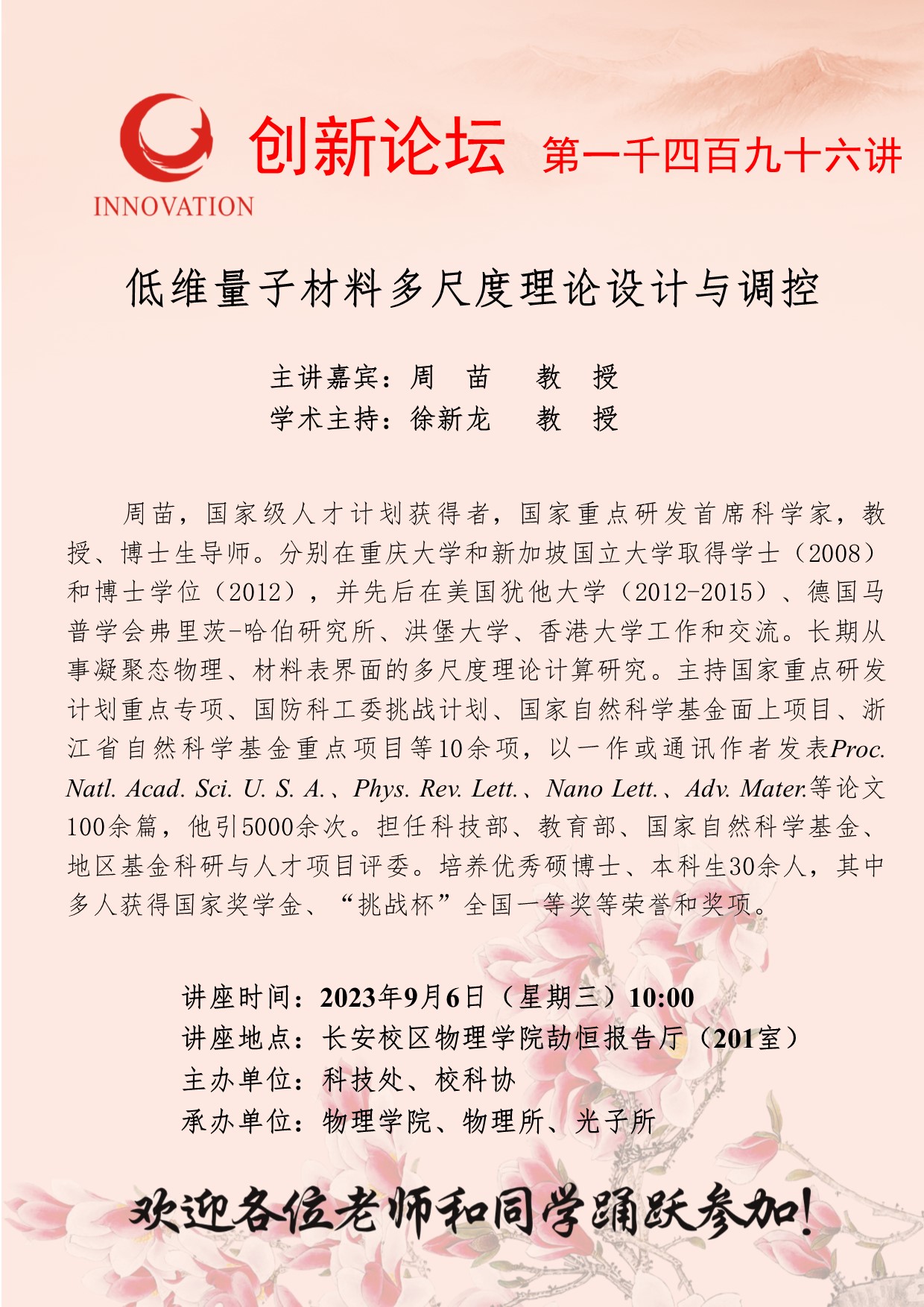 周苗 教授 广发体育创新论坛第一千四百九十六讲:低维量子材料多尺度理论设计与调控 讲座时间 2023年9月6日(星期三)10:00 讲座地点 长安校区物理学院劼恒报告厅(201室) 讲座人介绍 周苗 教授 讲座内容