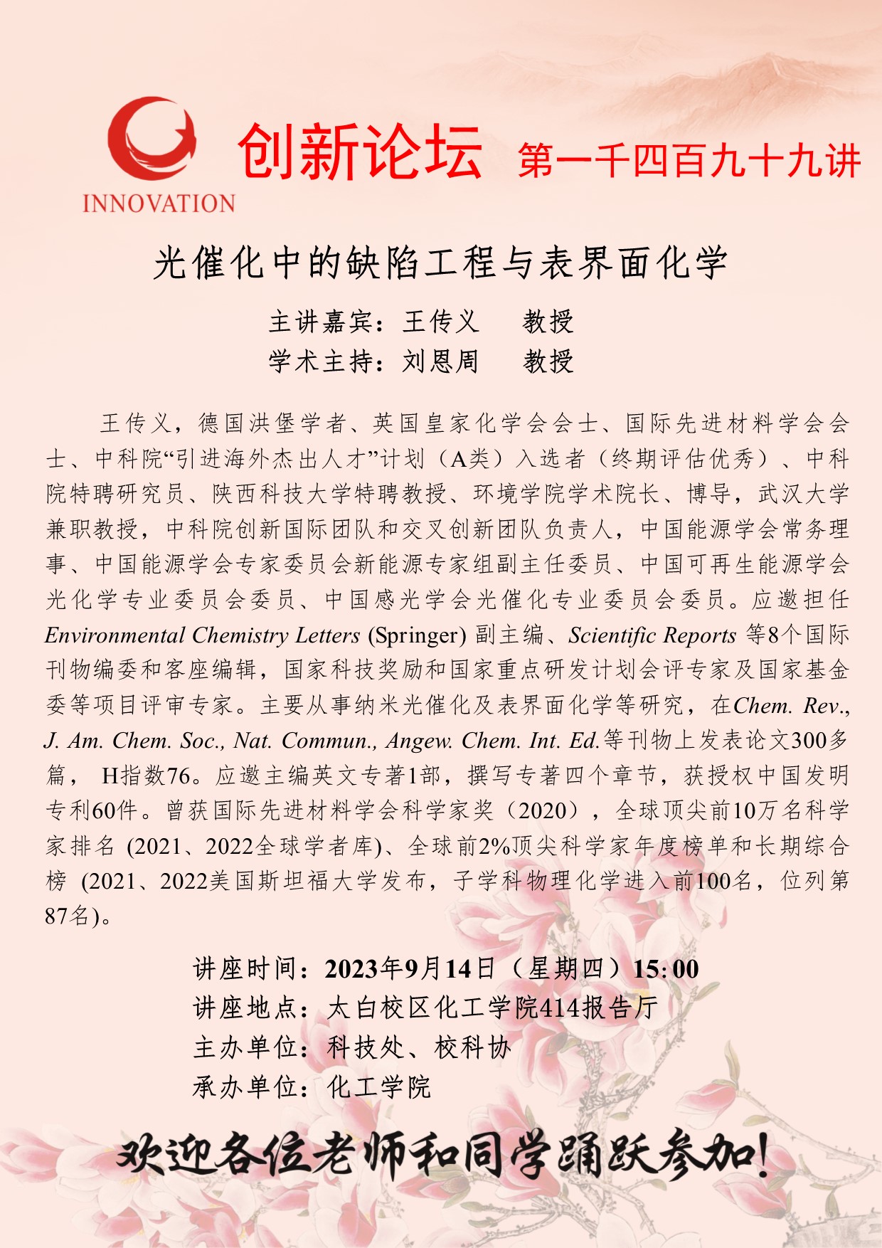 王传义 教授 广发体育创新论坛第一千四百九十九讲:光催化中的缺陷工程与表界面化学 讲座时间 2023年9月14日(星期四)15:00 讲座地点 太白校区化工学院414报告厅 讲座人介绍 王传义 教授 讲座内容
