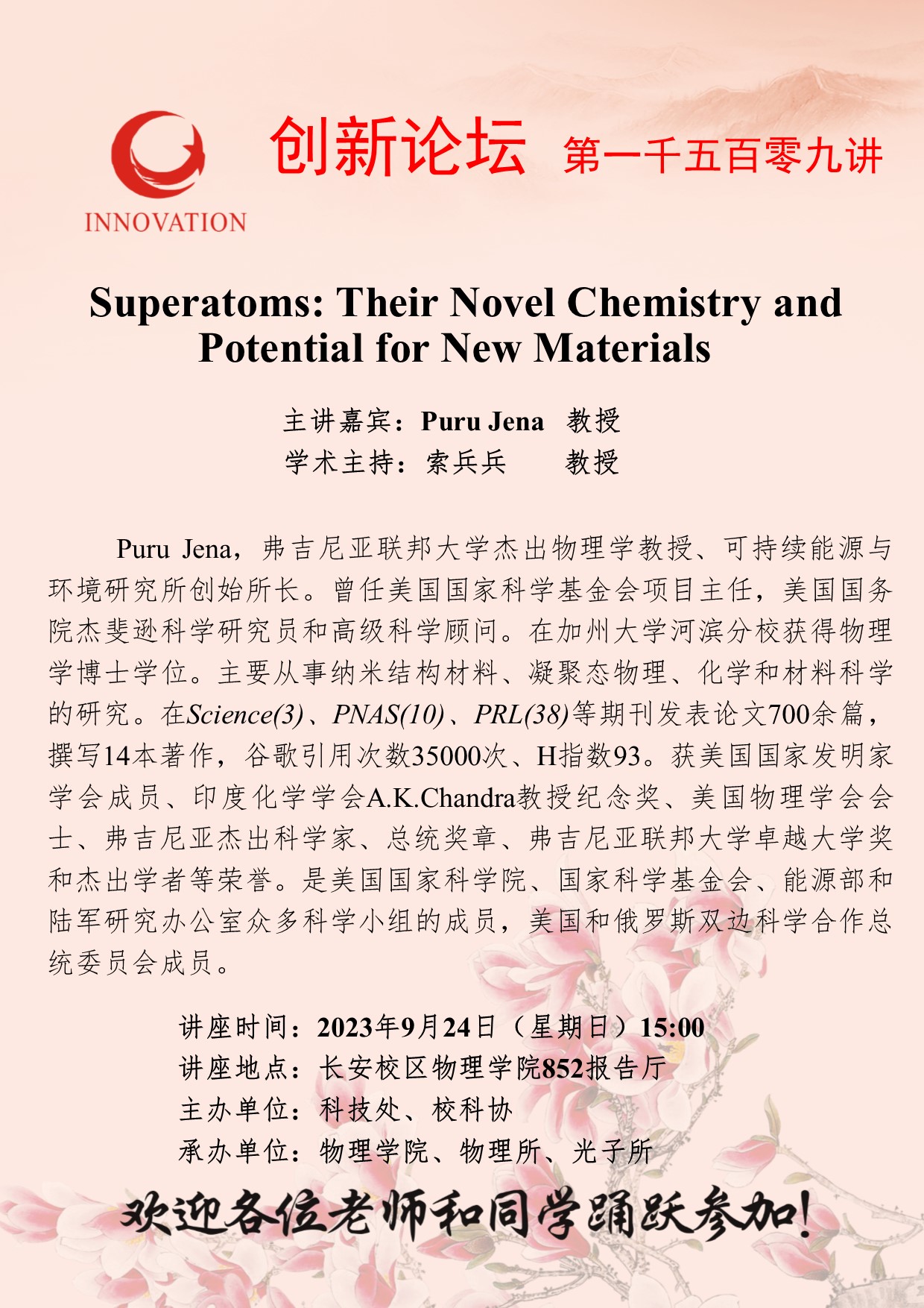 Puru Jena 教授 广发体育创新论坛第一千五百零九讲:Superatoms: Their Novel Chemistry and Potential for New Materials 讲座时间 2023年9月24日(星期日)15:00 讲座地点 长安校区物理学院852报告厅 讲座人介绍 Puru Jena 教授 讲座内容