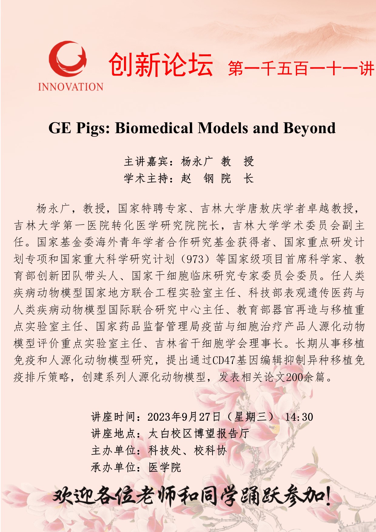 杨永广 教 授 广发体育创新论坛第一千五百一十一讲:GE Pigs: Biomedical Models and Beyond 讲座时间 2023年9月27日(星期三) 14:30 讲座地点 太白校区博望报告厅 讲座人介绍 杨永广 教 授 讲座内容