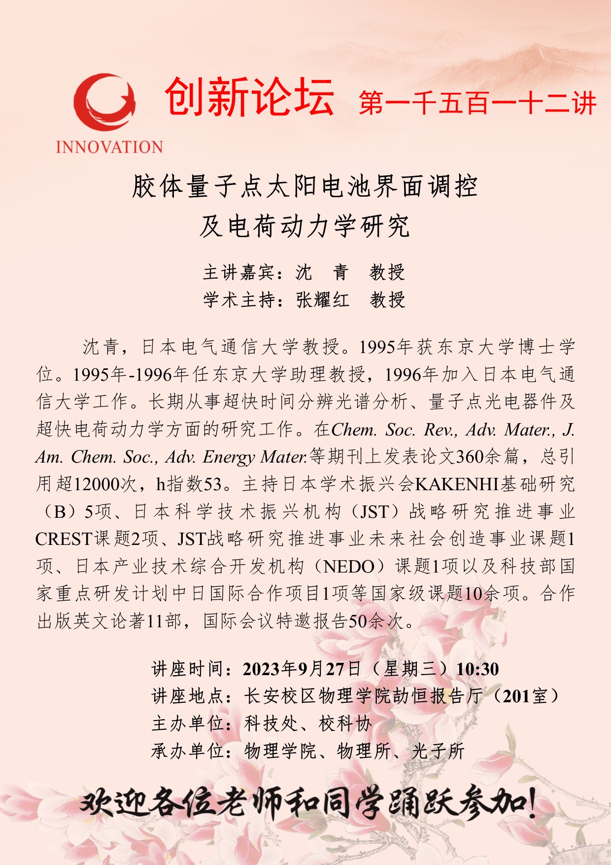 沈青 教授 广发体育创新论坛第一千五百一十二讲:胶体量子点太阳电池界面调控及电荷动力学研究 讲座时间 2023年9月27日(星期三)10:30 讲座地点 长安校区物理学院劼恒报告厅(201室) 讲座人介绍 沈青 教授 讲座内容
