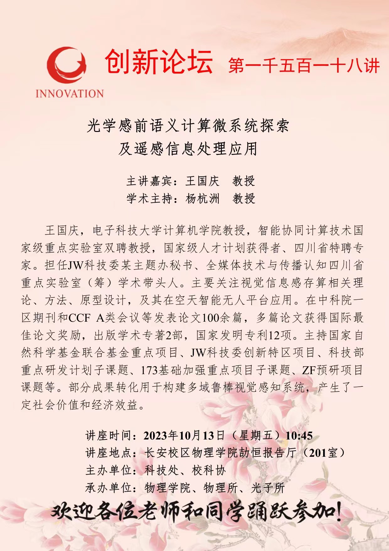 王国庆 教授 广发体育创新论坛第一千五百一十八讲:光学感前语义计算微系统探索及遥感信息处理应用 讲座时间 2023年10月13日(星期五)10:45 讲座地点 长安校区物理学院劼恒报告厅(201室) 讲座人介绍 王国庆 教授 讲座内容